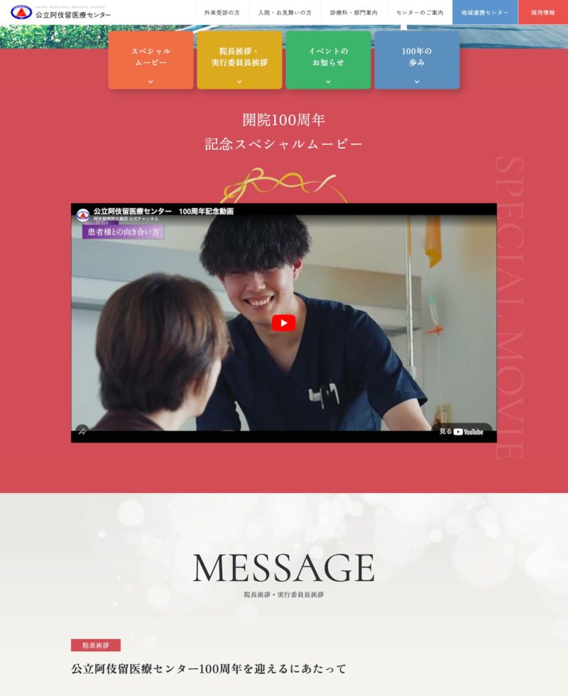 急性期から回復期、緩和ケアまで多様な病棟を持ち、最新の医療機器と専門医による治療で地域の中核を担う公立阿伎留医療センター様。病院サイトのリニューアルと共に、開院100周年を記念した特設ページを制作しました。100年の歴史を振り返るとともに、病院の”今”と”未来”を伝えるスペシャルムービーを弊社で撮影しています。最前線で働く医療従事者の姿や、温かい病院の雰囲気を映像に収め、より深く魅力を伝えるコンテンツに仕上げています。