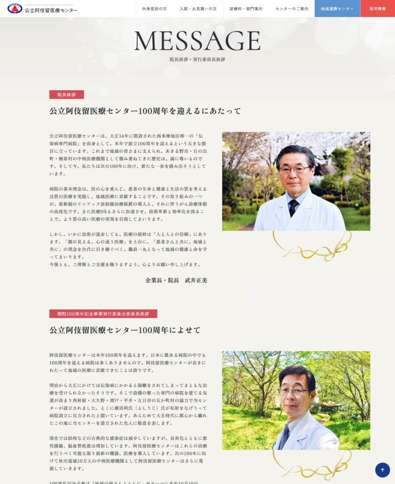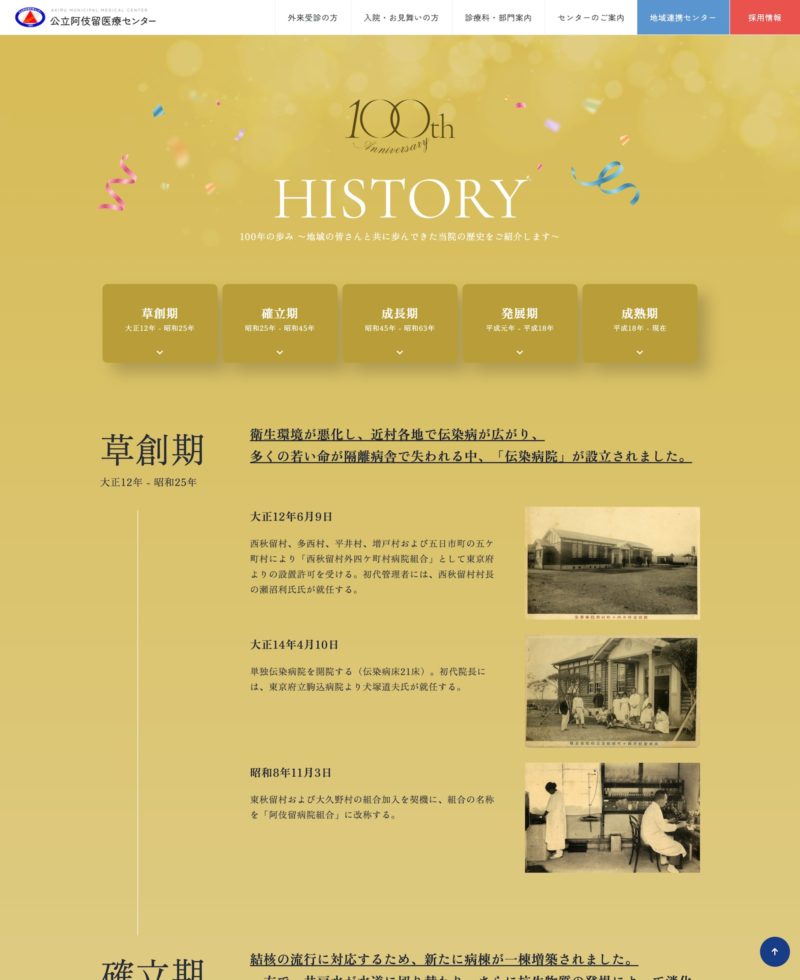 - 東京都あきる野市にある公立阿伎留医療センター様の開院100周年を記念した特設ページです。 病院の歴史・これまでの歩みを紹介するとともに、地域へのメッセージを発信しています。