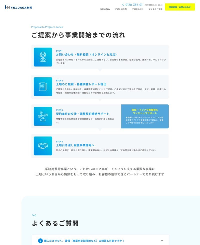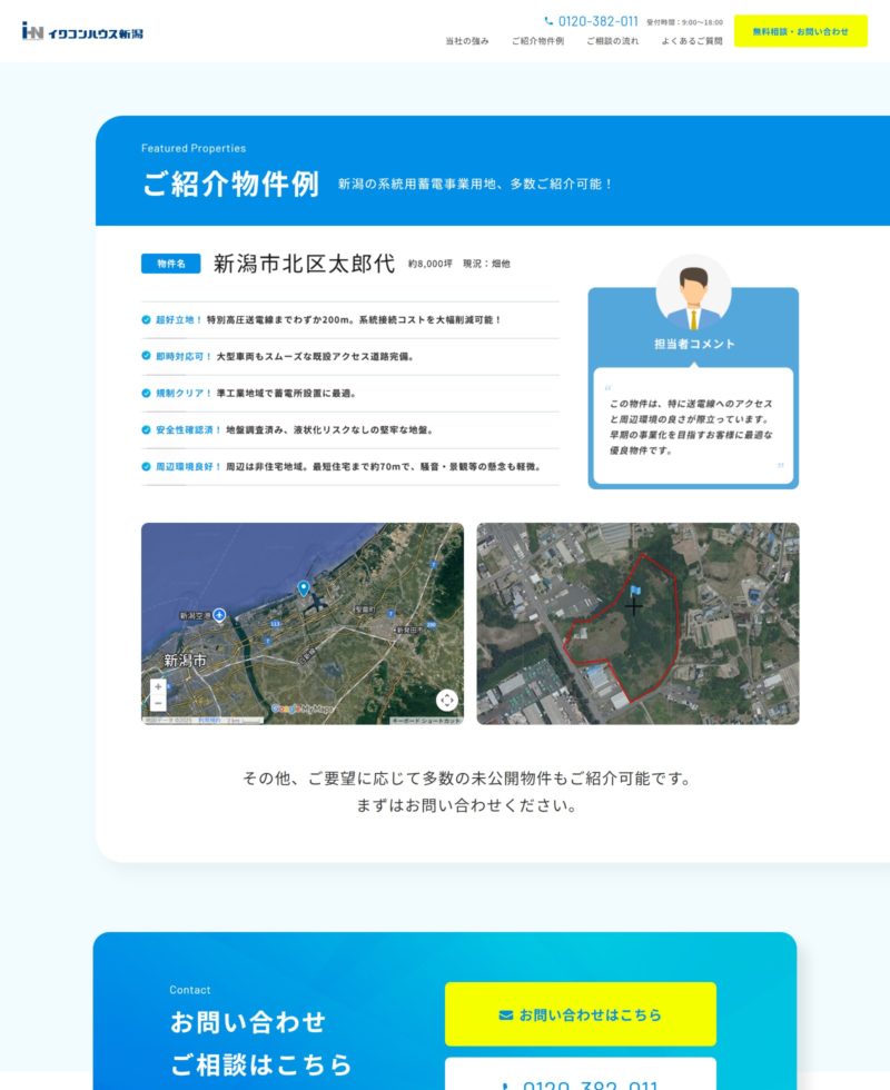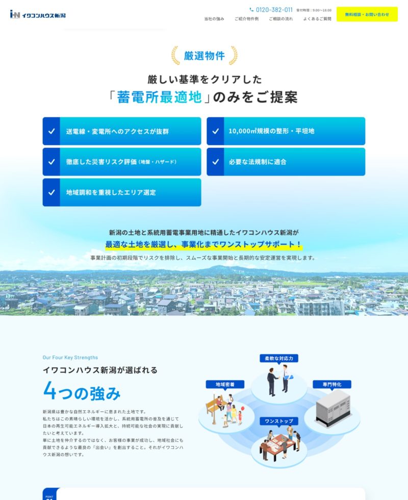 - イワコンハウス新潟株式会社様による、系統用蓄電事業用地紹介のLPサイトです。新潟の不動産に強みを持つイワコンハウス新潟株式会社様が、条件に合った土地情報を紹介し蓄電池事業の拡大をワンストップでサポートしています。