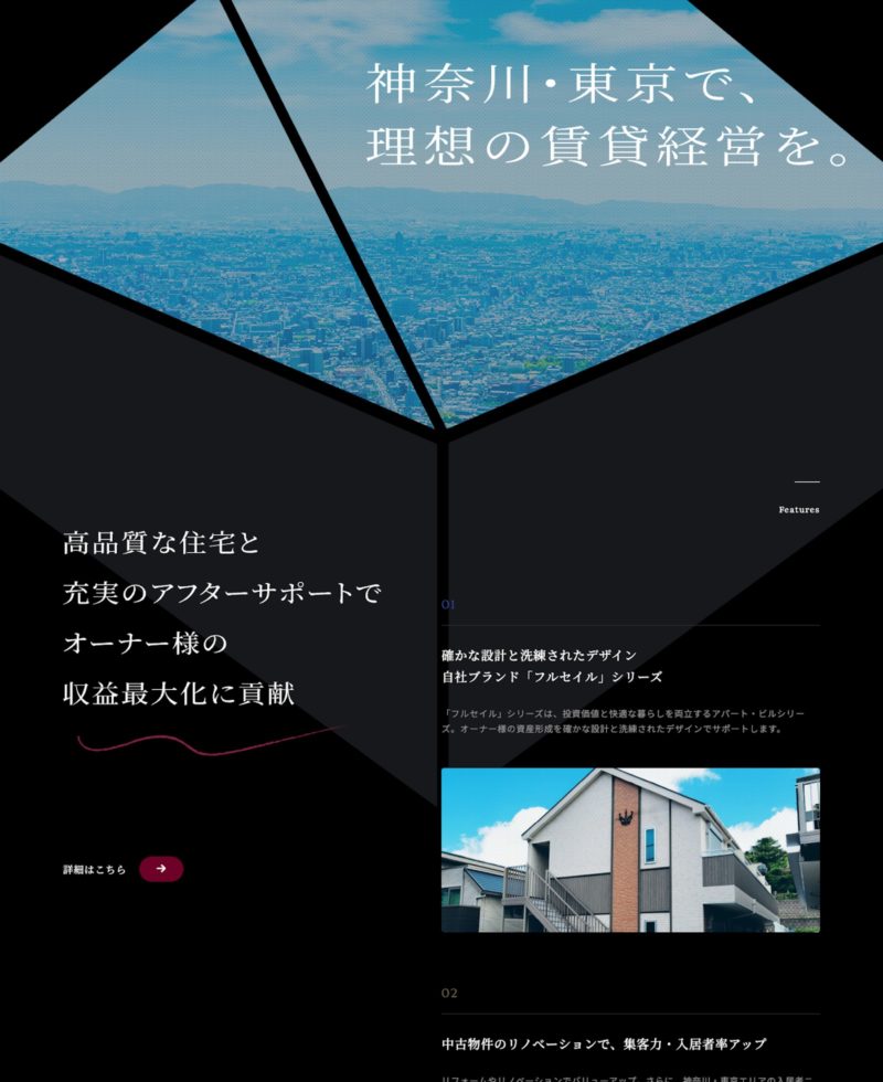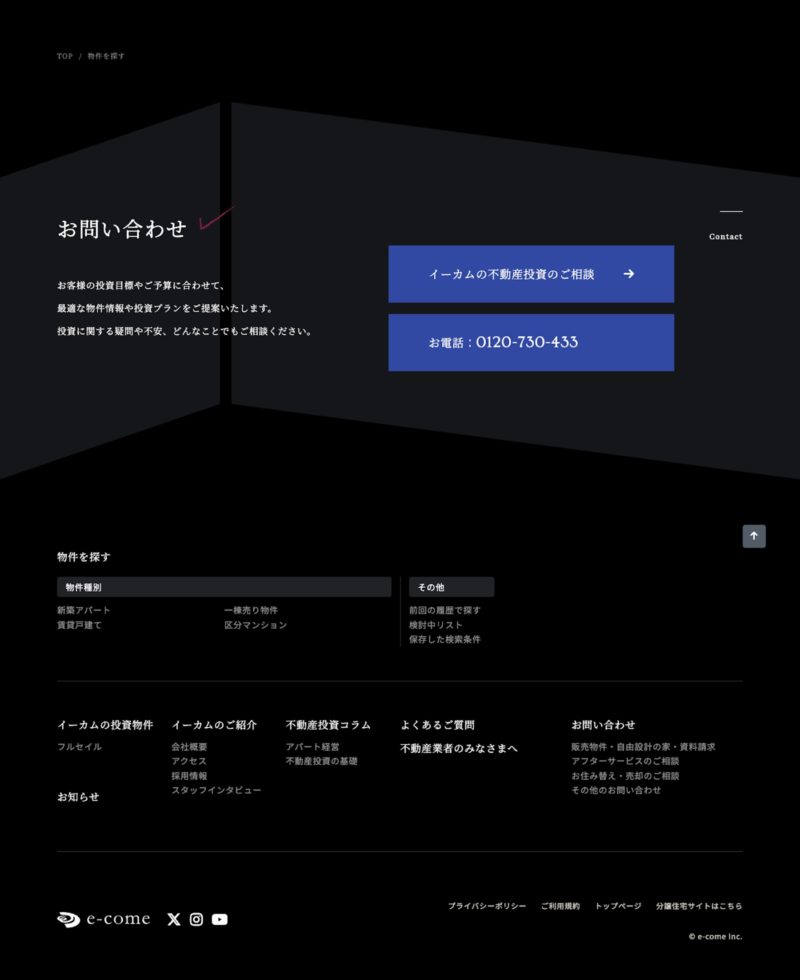 サイト全体を落ち着いたトーンでまとめ、不動産投資や収益物件という信頼や価値を強調した配色や余白、キーワードの目立たせ方を意識しました。また、すぐに物件検索ができる「クイック検索」やテーマ別で探せるメニューなど、エンドユーザーの行動を促進する情報設計となっております。