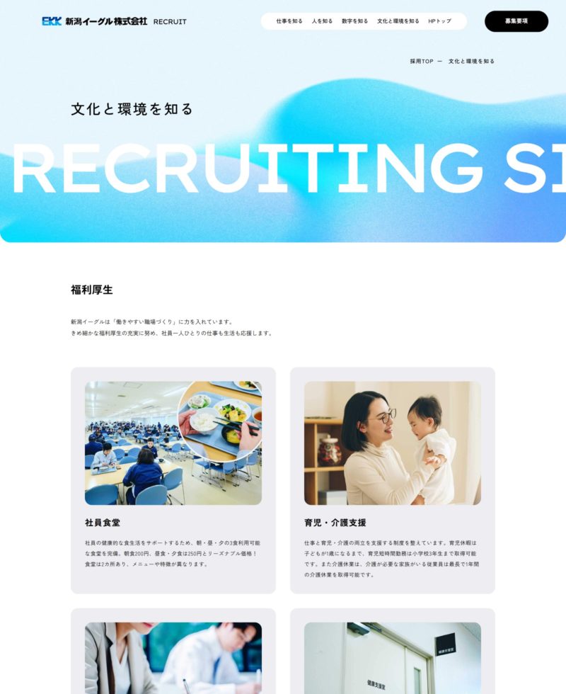 採用を目的にしたHPの新規制作ということで、HP内に採用サイトを設ける形式で2サイトを制作しました。地元での採用を重視していたため、コンテンツは地元への想いや考え方が伝わるような構成にしました。デザインは展開している事業に対するハードルを下げるため、カジュアルなテイストにし、アニメーションも加えています。