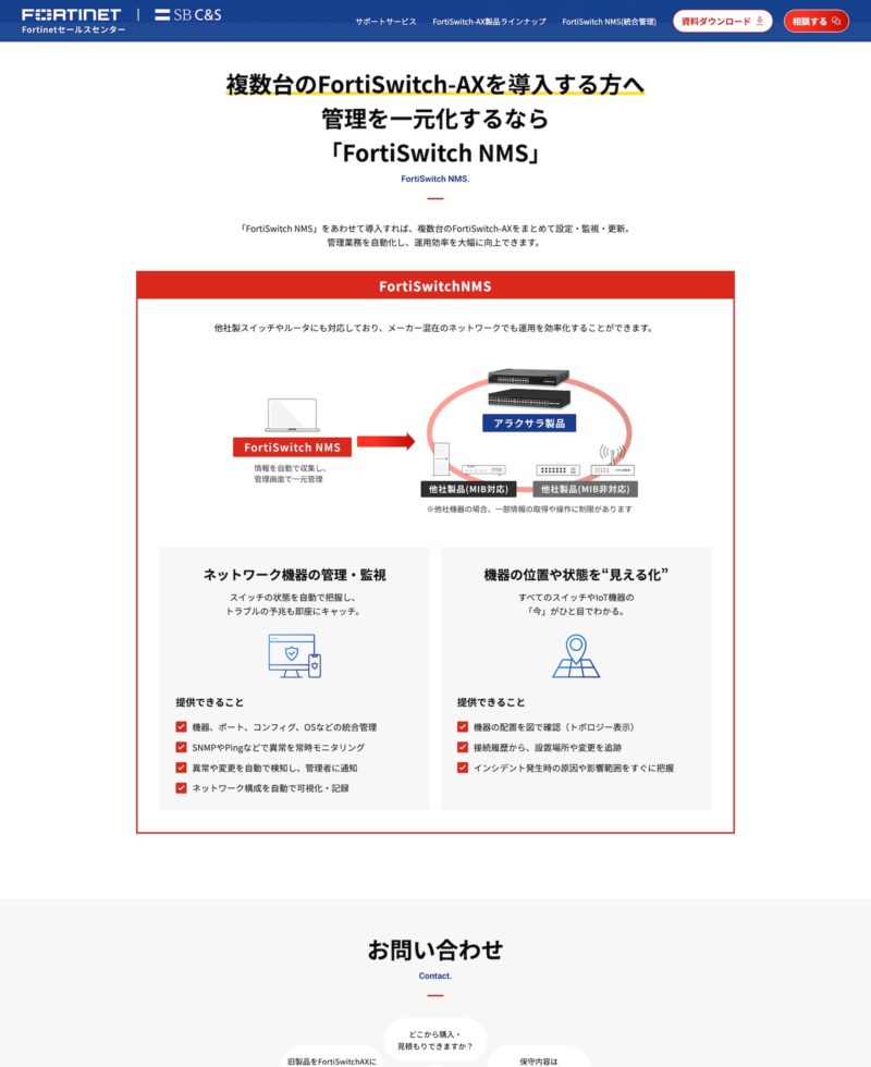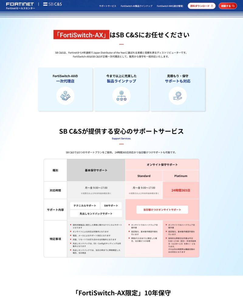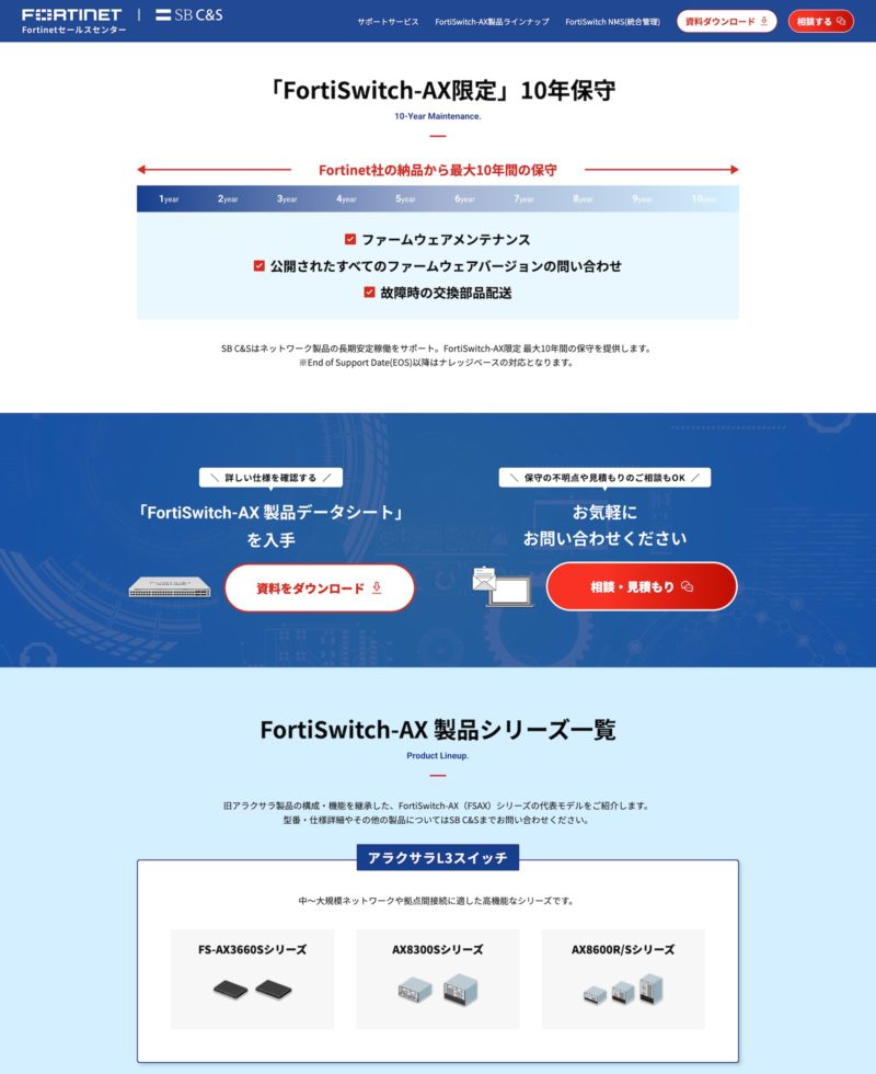 - Fortinet製品の正規一次代理店であるSB C&S様が展開する「FortiSwitch-AX(Fortinet様とアラクサラ様の共同開発スイッチ)」のLPです。SB C&S様では「FortiSwitch-AX」の仕入れ対応、製品選定から保守まで、販売店様のビジネスをトータルで支援しています。