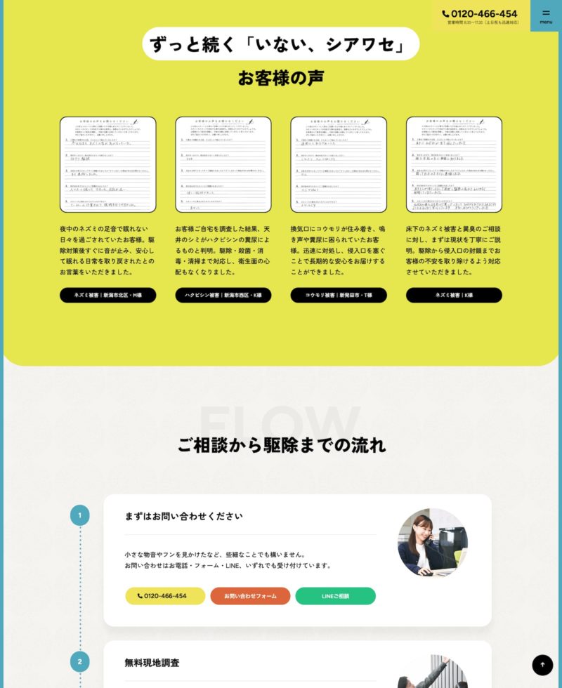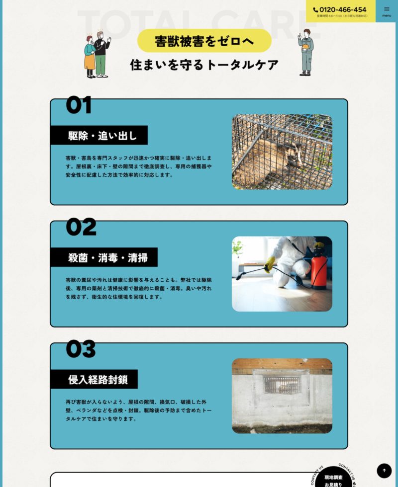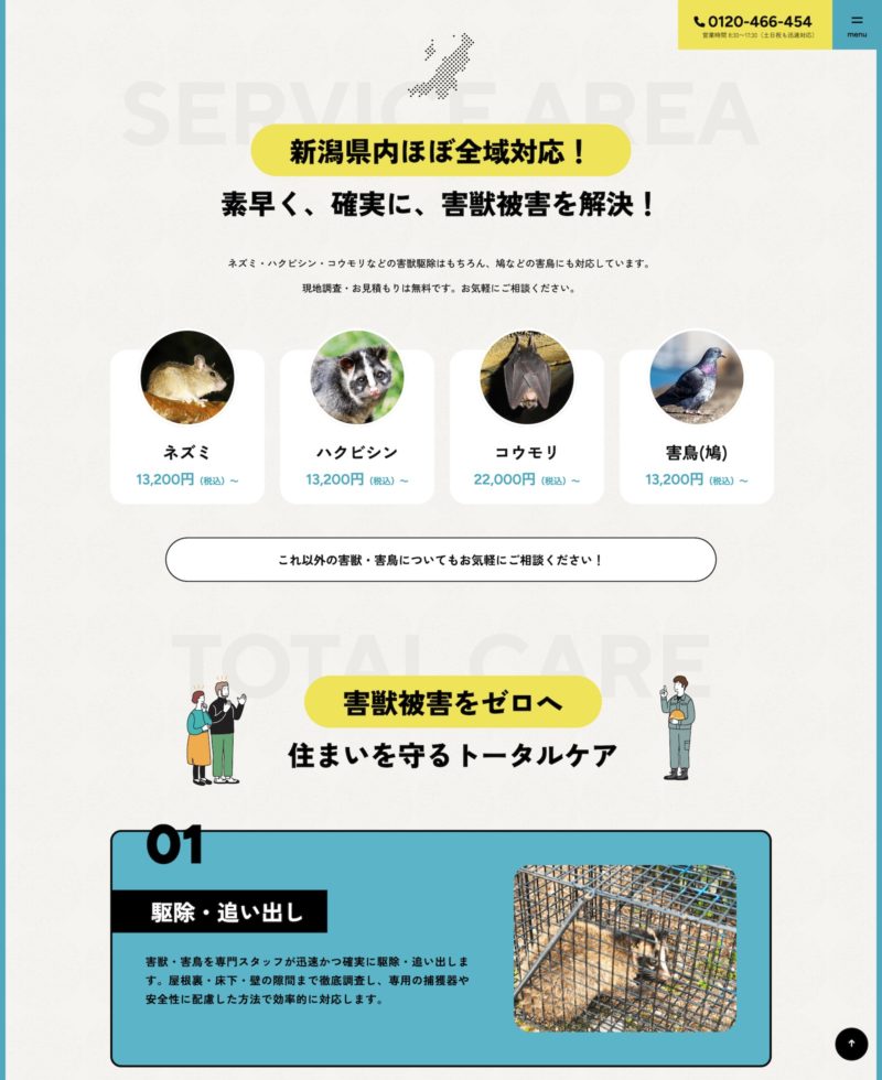 全体的に害獣駆除サービスの専門性を強調したコンテンツ構成や、スタッフ画像とキャッチコピーで即時的な問題解決を訴求します。また、黄・青・白を基調とした配色で清潔感と信頼性を与えます。 お客様のお悩みリスト(夜中の物音、フン被害)を箇条書きで並べて共感を誘い、該当する害獣写真と価格表示によりサービス内容が直感的に把握できる、など伝わりやすい流れや見せ方を意識しました。