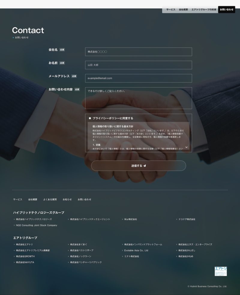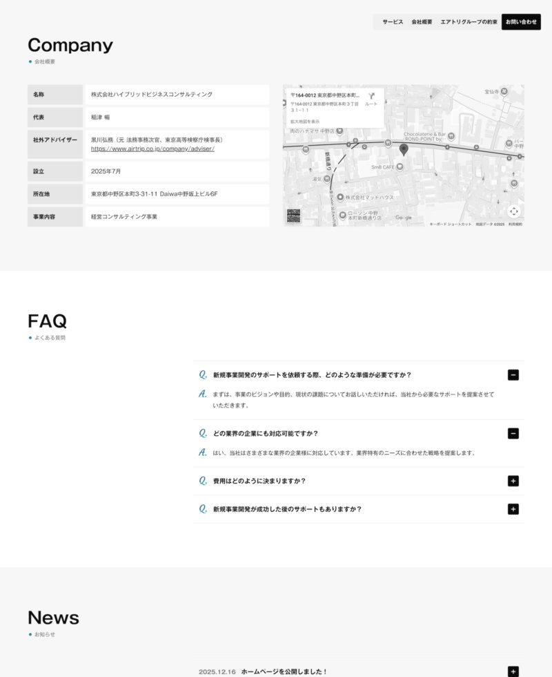 戦略的な経営コンサルティングと新規事業開発の価値を直感的に伝えるサイト設計を行いました。トップページで「戦略と実行をハイブリッドに融合する」といったコンセプトを明示し、対象顧客の課題別ソリューションや成功事例を分かりやすく提示することで信頼性を強化。専門性と親しみやすさを両立させ、コンバージョンにつながる導線も配置しています。