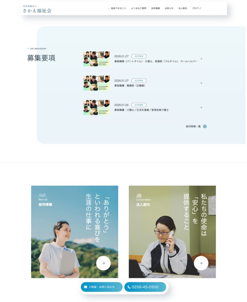 新潟県三条市で地域包括支援センターや特別養護施設などを運営するさかえ福祉会様のWebサイトを全面リニューアル。介護者・利用者・求職者それぞれに情報が十分に届いていないという課題に対し、「誰に」「何を」伝えるかを整理し、ブランディング面から支援しました。「介護について気軽に相談でき、困ったときに真っ先に思い出してもらえる窓口」をコンセプトに、安心感と信頼感を重視した設計へ刷新。写真を主役にしたデザインと、トップページで幅広い事業内容を分かりやすく伝える構成で、最初の接点として頼れるWebサイトを実現しました。
