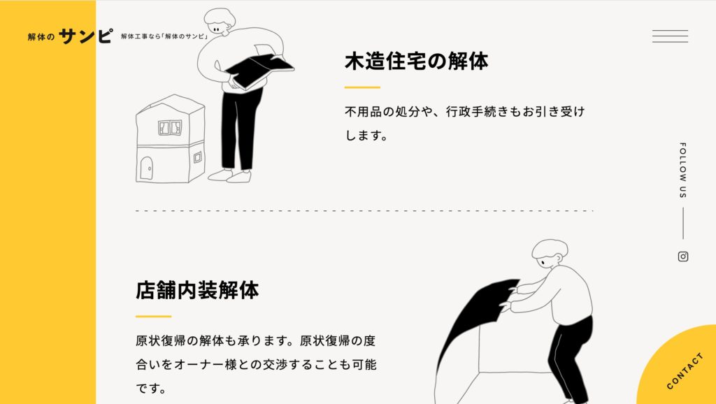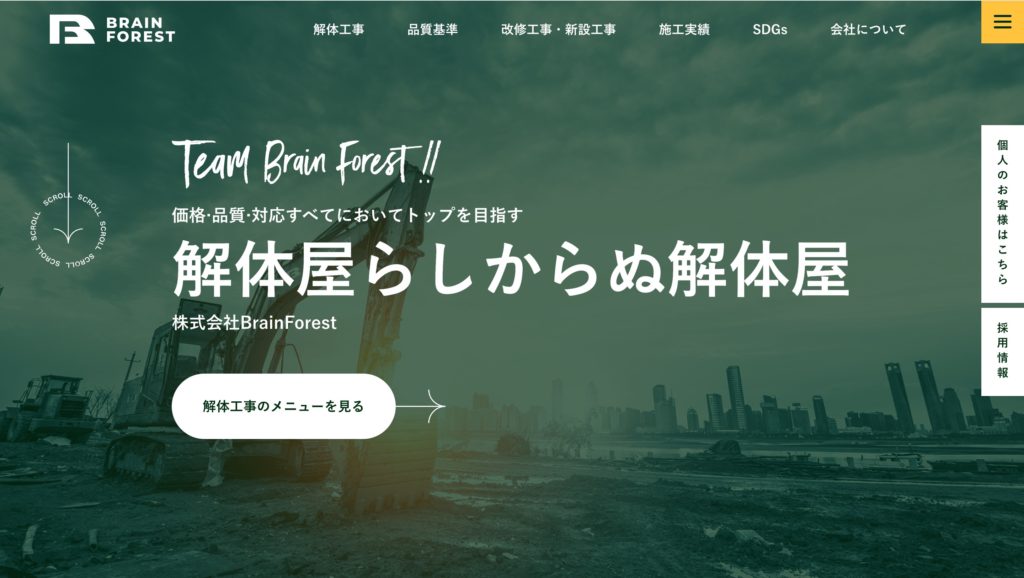 解体業に対する「怖い」「荒い」といった先入観をやわらげることを意識し、親しみやすさを前面に打ち出したホームページです。