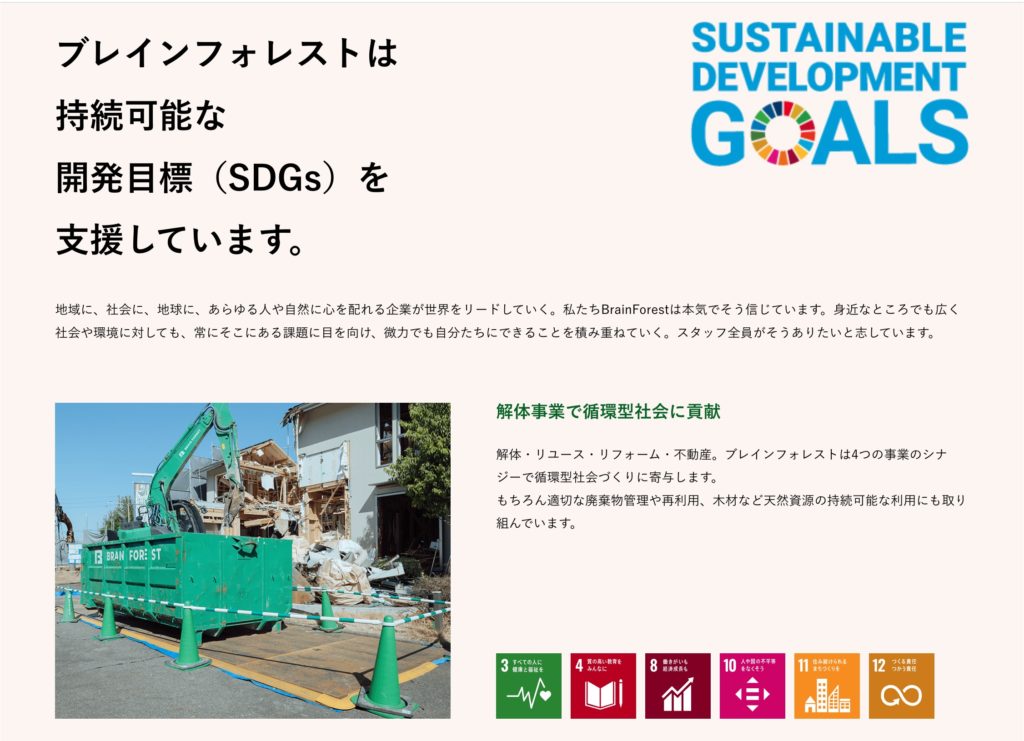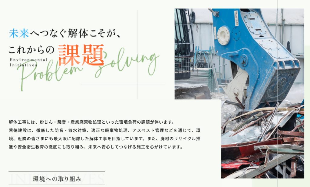 また、SDGsへの取り組みを明確に打ち出している点も特徴的です。環境や地域社会への配慮を可視化することで、「ただ壊すだけの仕事ではない」というスタンスが感じられ、解体業に対するネガティブな印象をやわらげています。
