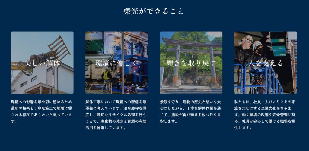 「榮光ができること」として、「美しい解体」や「輝きを取り戻す」といった価値観を一貫した世界観で提示し、解体業の仕事に清潔感と美意識を与えています。
