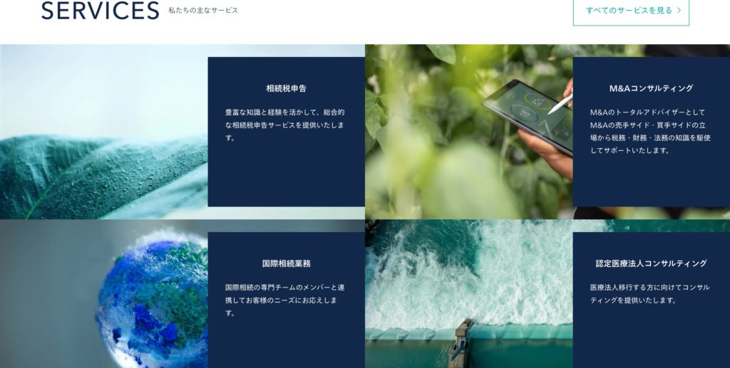 事業内容の紹介では、相続税・国際税務・コンサルティングなどの分野が体系的に整理されており、専門チームによる高度な総合対応力が伝わる構成です。