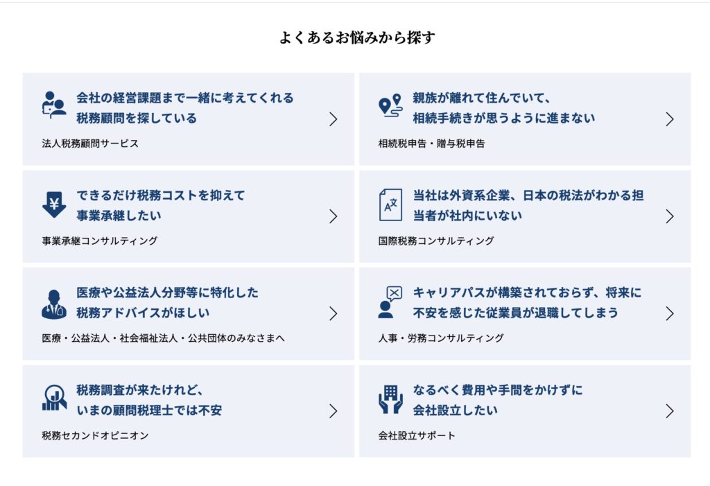 サイト内では、「よくあるお悩みから探す」という導線が設けられており、「相続の手続きがわからない」「会社設立時の税務対応を相談したい」など、利用者が抱える課題から自然にサービス内容へアクセスできる構成になっています。