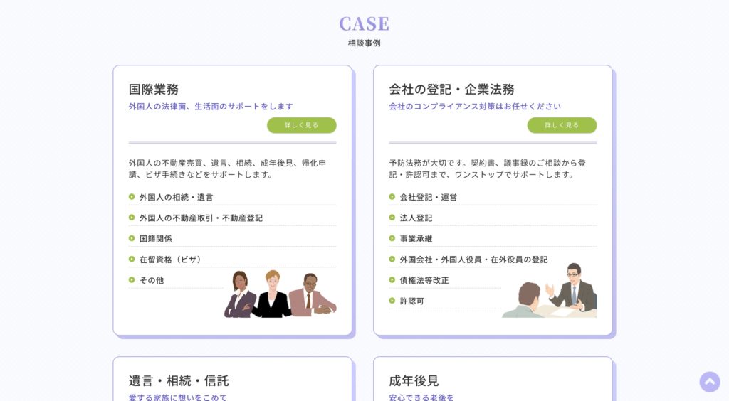 トップページの中で主な取り扱い業務について触れているので、ユーザーは自分の課題を解決することができるか、ページを遷移せずに確認することができます。