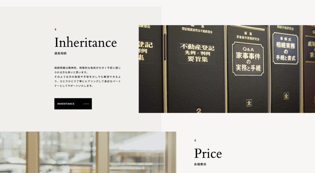 メインビジュアル直下の事務所紹介のセクションや、サービスの紹介のセクションでは、写真と文章を互い違いにレイアウトすることで、単調になってしまうことを回避しています。
