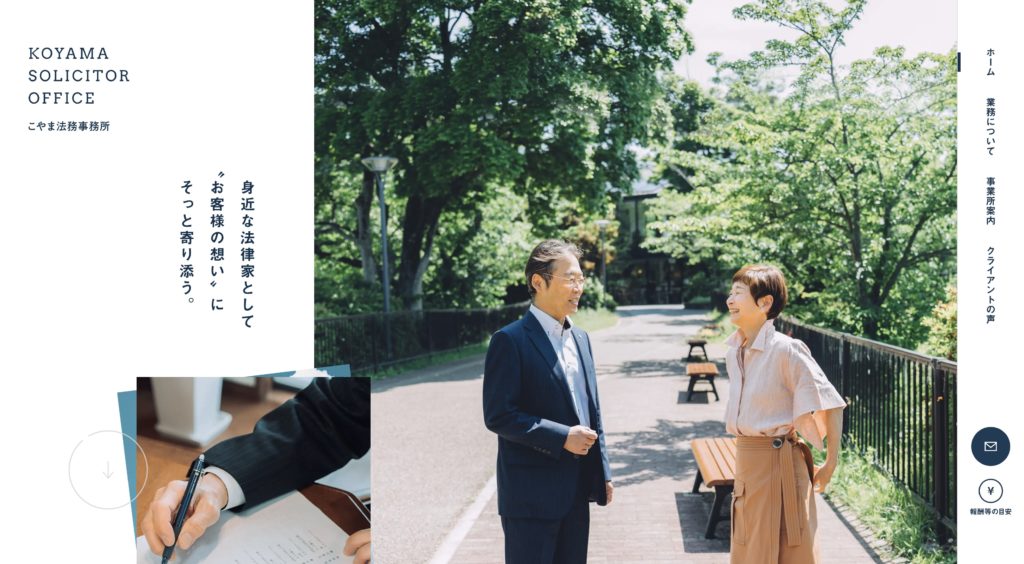 ホームページのメインビジュアルには、相談者と小山代表が日差しのもとで歓談する様子が映した写真を採用しています。