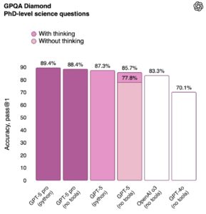 さらに博士レベルの科学問題GPQAでは、GPT-5はthinking+Python併用で正答率89.4%。一方GPT-4oは70.1%にとどまり、約19ポイントの差。ツールなしでもGPT-5は85.7%と4oを上回る。高度な推論や計算が絡む課題で、GPT-5は精度・実務適性ともに優位と言える。大学研究や専門分析での活用が有望だ。
