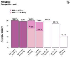 GPT-5は数学、コーディング(プログラミング)、視覚認識、医療など幅広い分野のテストでGPT-4世代を上回る最高水準のスコアを記録しています。例えば、実践的なコーディング課題の評価指標で約74.9%を達成し(GPT-4oは約52%)、高校レベル(アメリカ)数学テストでは94.6%正答(GPT-4oは88.9%)といった具合です。
