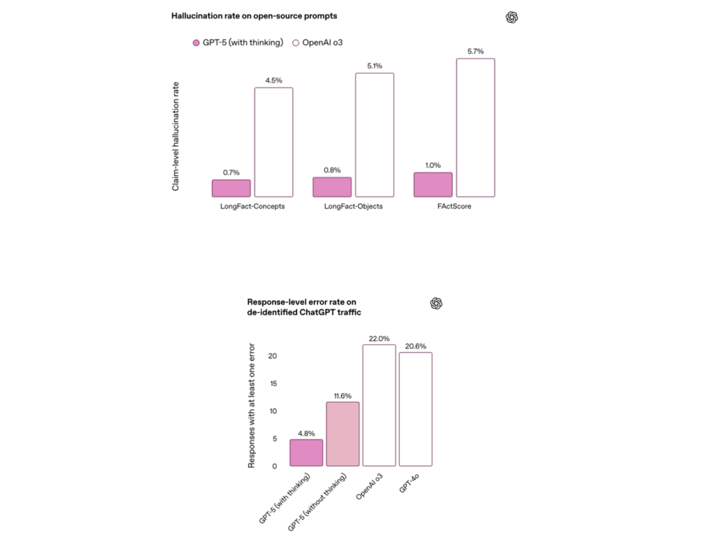 OpenAIの評価では、ChatGPTの実運用に近い条件で測ると、GPT-5の事実誤認率はGPT-4oより約20%低下。さらに推論モード(GPT-5 Thinking)では、旧モデルのOpenAI o3より約70%少ないとされています。