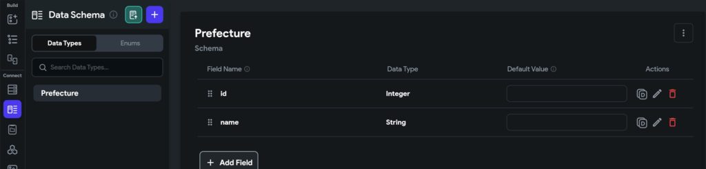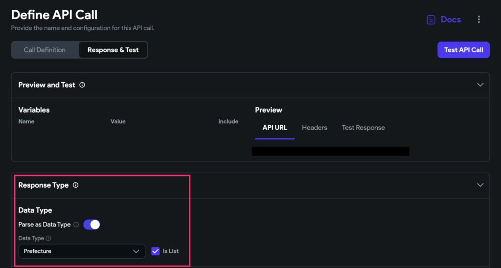 idとnameを持つデータタイプを新規作成し、APIコールの設定でレスポンスのJSONを作成したデータタイプとして扱うように設定します。