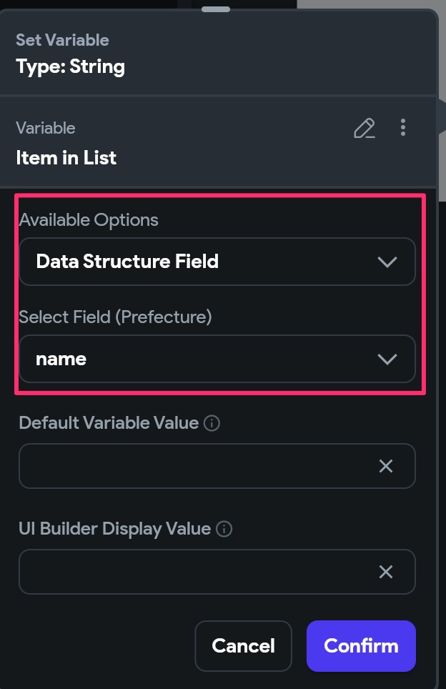 Available Options 項目を「Data Structure Field」を選択し、Select Field 項目を「name」を選択し、Confirmをクリックします。