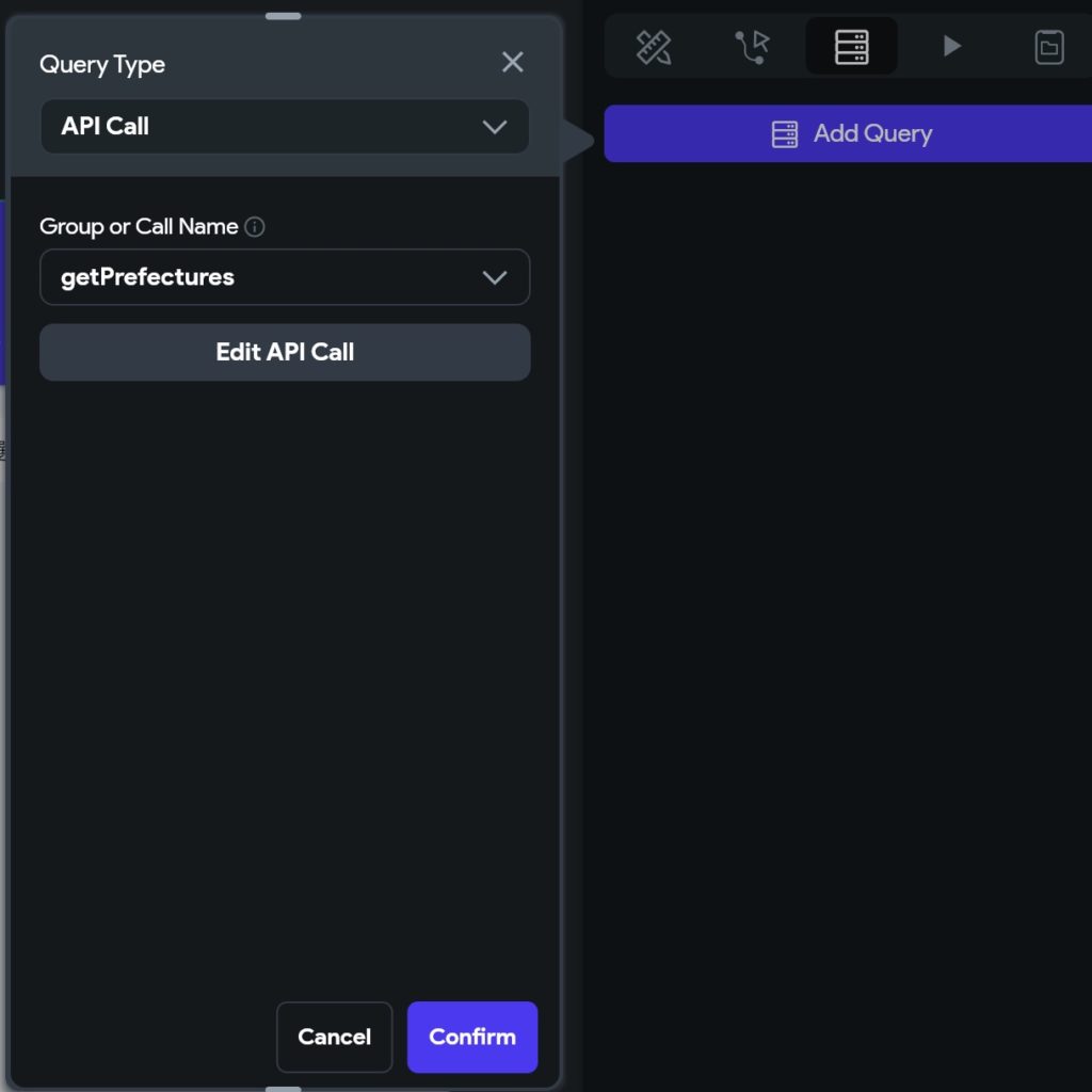 Query Typeは「API Call」、Group of Call Nameは「データ取得する該当のAPI」を選択します。