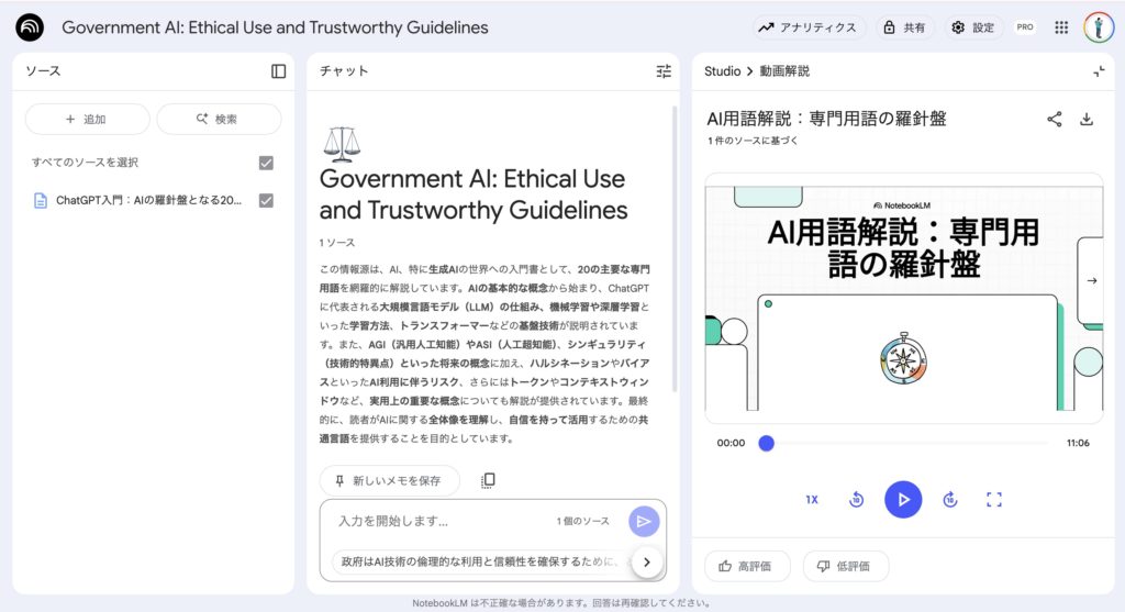 - 対応形式は PDF / .txt / Markdown / mp3 など。アップロードが完了すると左ペインにタイトルが並びます。