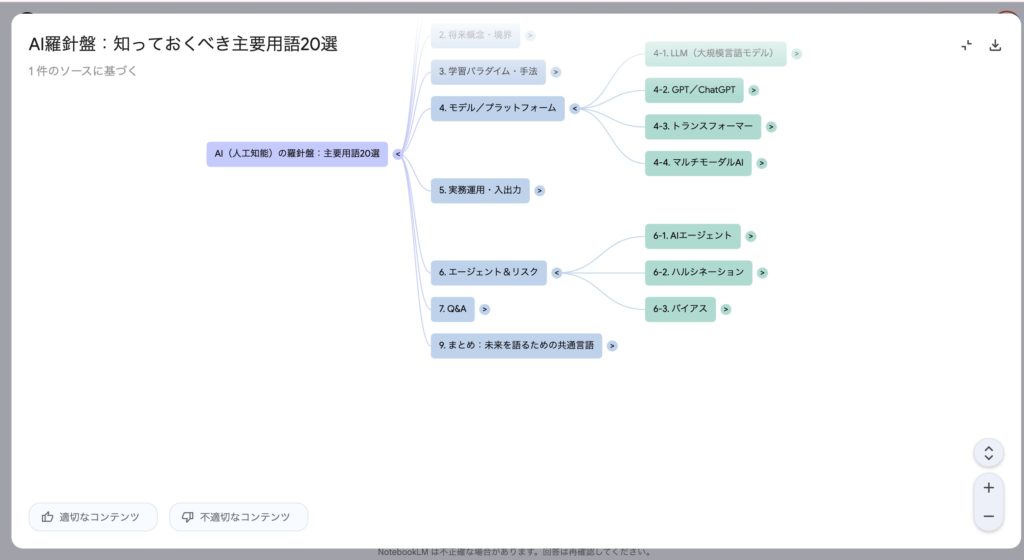 - マインドマップ機能の追加: 複雑なテーマの資料群を視覚的に整理する「マインドマップ」機能も2025年3月にNotebookLMに追加されています。関連するキーワードや概念をAIが自動抽出し、ノートブック内でインタラクティブなマップとして表示します。ユーザーはマップ上のノード(テーマ)をクリックして辿ることで、新たな繋がりや見落としていたトピックを発見でき、資料全体の理解が深まります。例えば環境問題に関する複数のレポートをまとめてアップロードすると、「気候変動」「生物多様性」「政策対応」などの主要トピックがマップ上に展開され、それぞれに関連するサブトピックや具体的項目も階層的に表示される、といったイメージです。知識を視覚的に整理できるこの機能はユーザーから好評で、現在ではNotebookLMのスタジオパネル内で他の出力(音声概要や動画概要、レポート類)と並行して閲覧することも可能になるなど、使い勝手の向上が図られています。教育現場やチームでのブレインストーミングにも役立つこのマインドマップ機能は、今後さらに発展が期待されます。