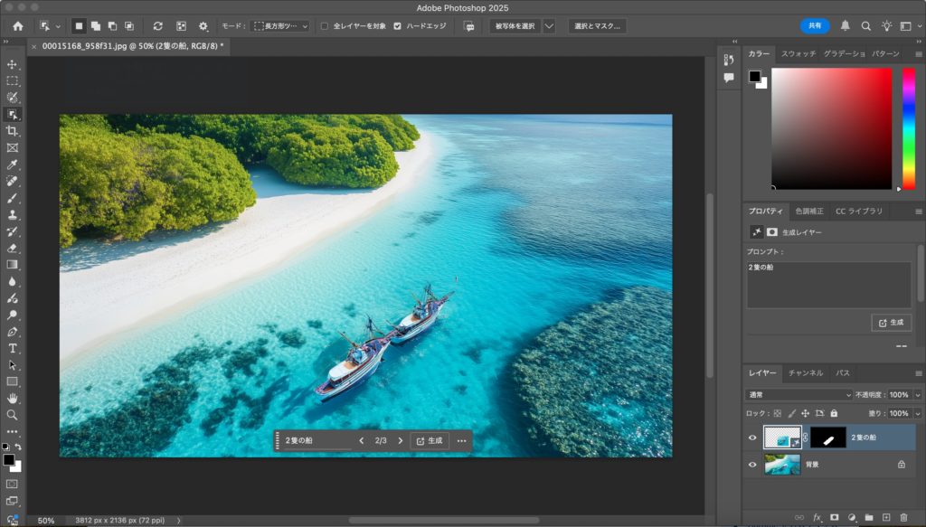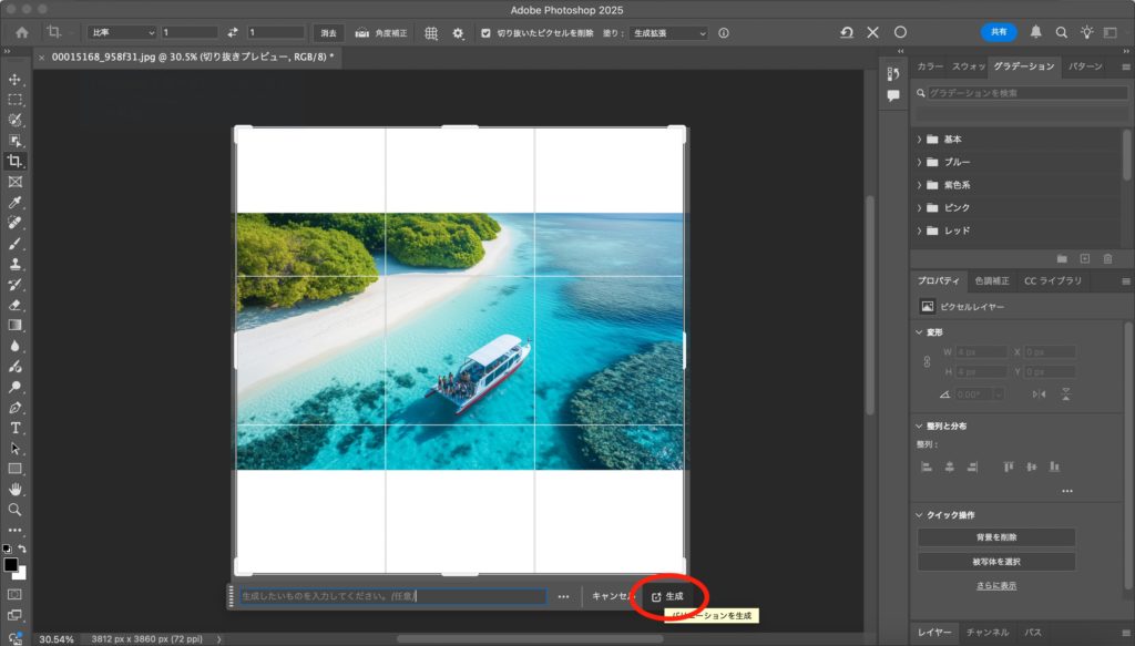 「生成塗りつぶし」は、選択範囲をAIが解析し、違和感のない画像を自動生成する機能です。