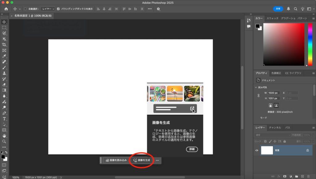 2.「生成塗りつぶし」ボタンをクリックします。(右クリックメニューからも可能)