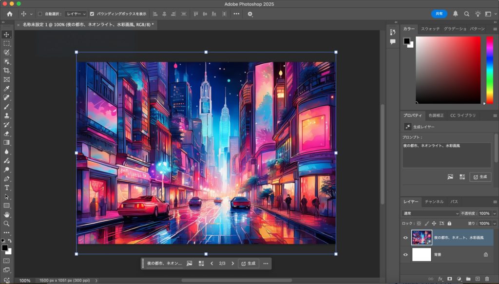 今回はFireflyに水彩画風の夜の都市を生成してもらいましょう。