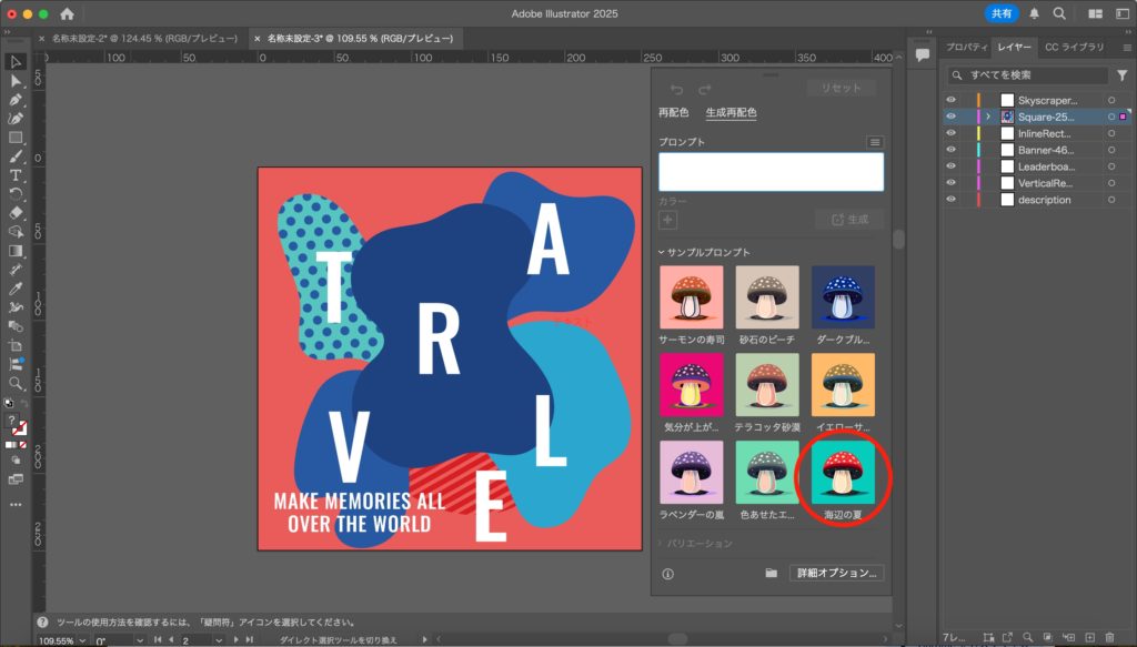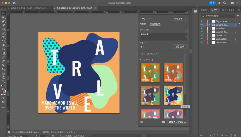 Illustratorでは、ベクターグラフィックに特化した生成AI機能が搭載されています。これにより、ロゴやアイコン制作、配色の調整が簡単にできるようになりました。