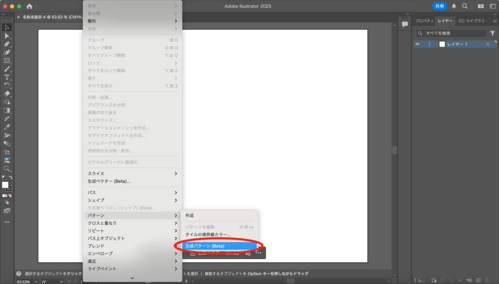 1.「オブジェクト」メニューから「生成パターン」を選択します。