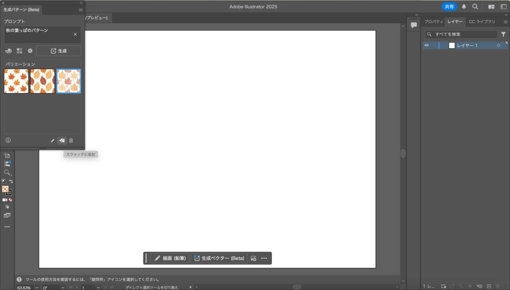 「生成パターン」は、テキストプロンプトを入力するだけで、AIがオリジナルのシームレスパターンを作成する機能です。