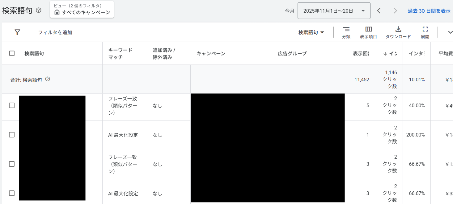 検索語句レポートで、「P-MaxのSearchから取れているテーマ」と「AI Max検索から取れているテーマ」を定期的に見比べ、どちらで取るべきかを決めていく運用が重要です。