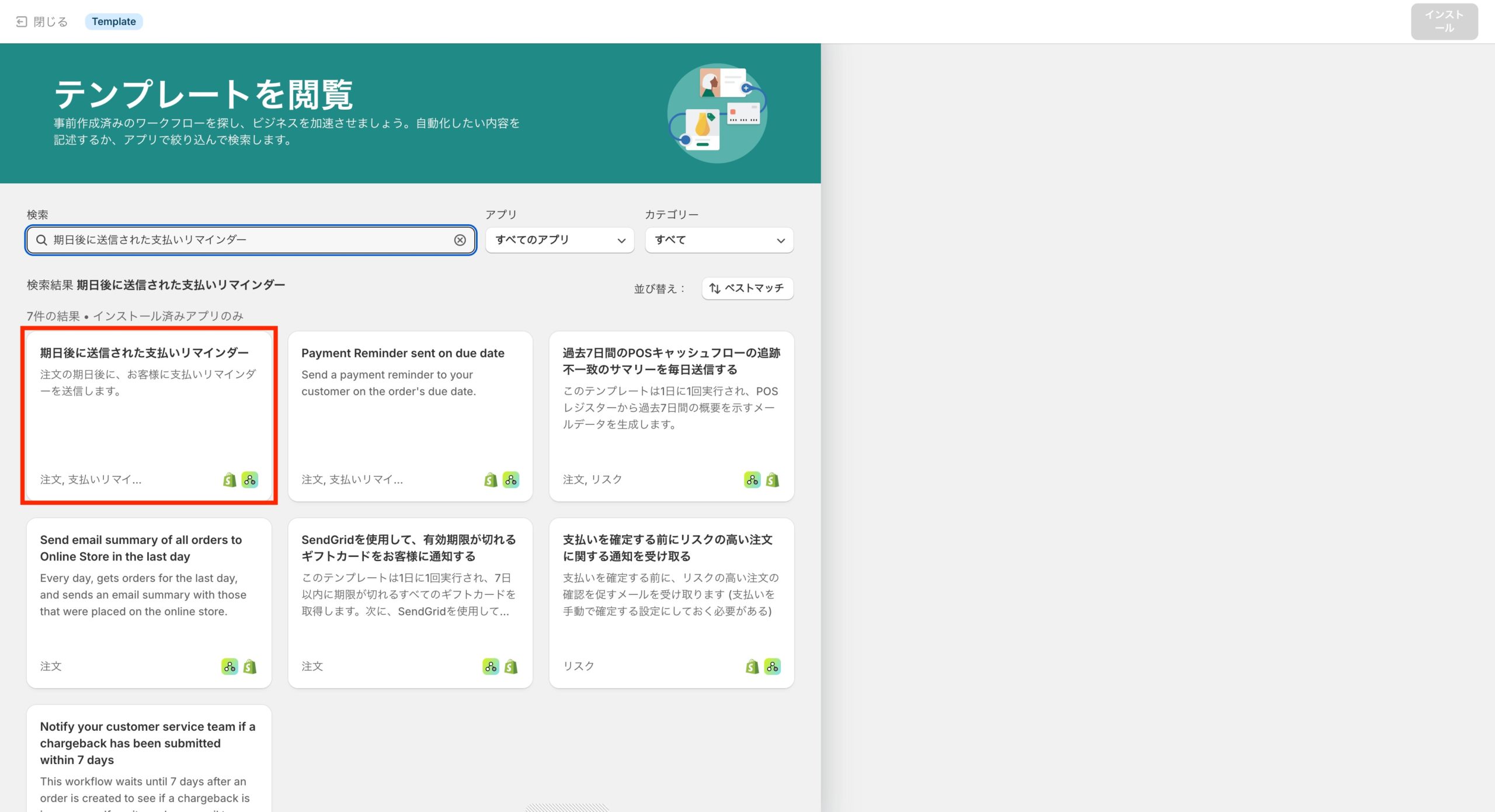 こうした「人的ミスによる請求漏れ」を防ぐために活用したいのが、Shopify Flowの 「期日後に送信された支払いリマインダー」テンプレート です。