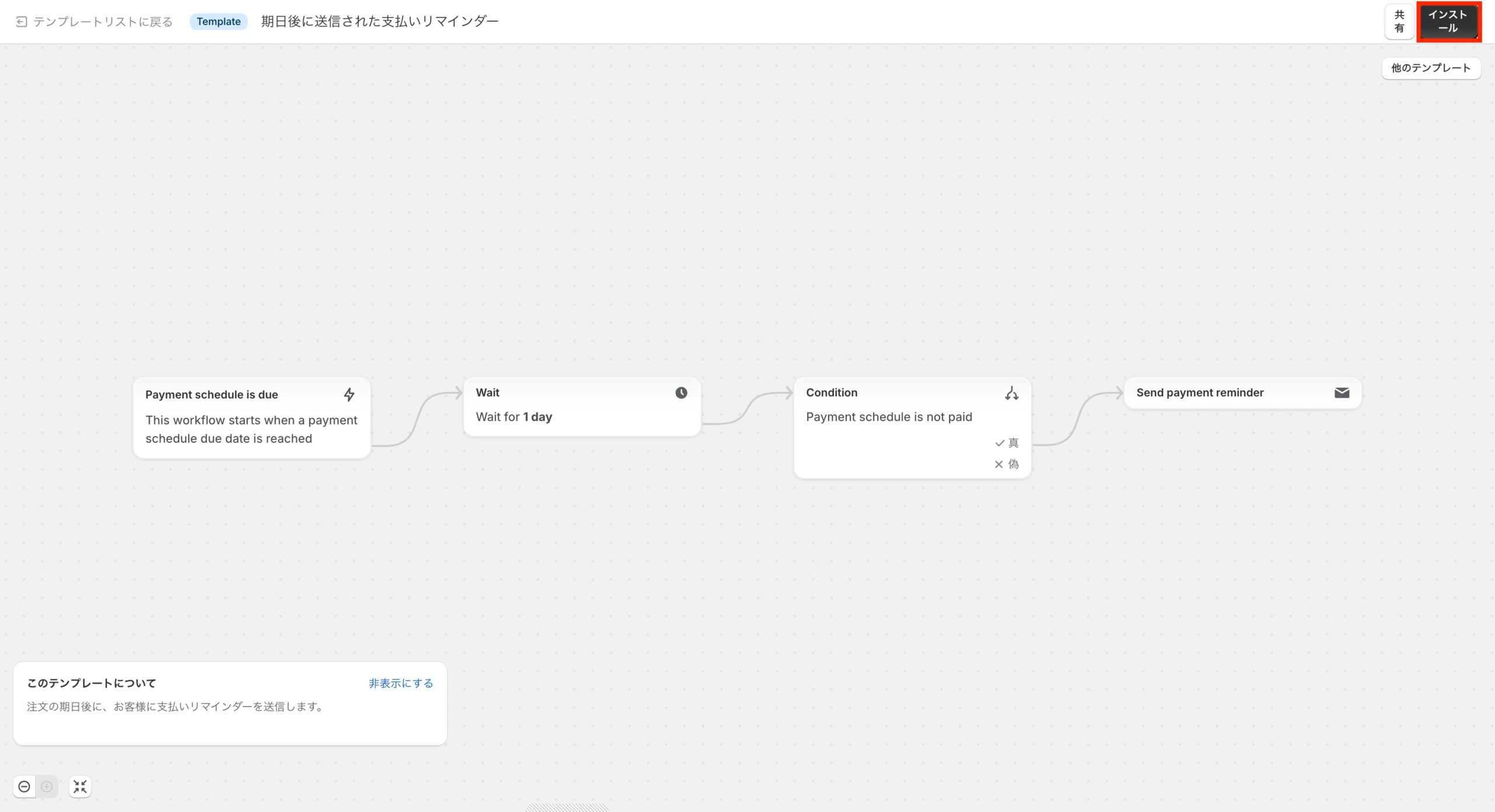 今回の「期日後に送信された支払いリマインダー」テンプレートは、Shopify が B2B の未払い管理に向けて提供している標準的なワークフローです。テンプレートには、あらかじめ次の 4つのステップが含まれています。