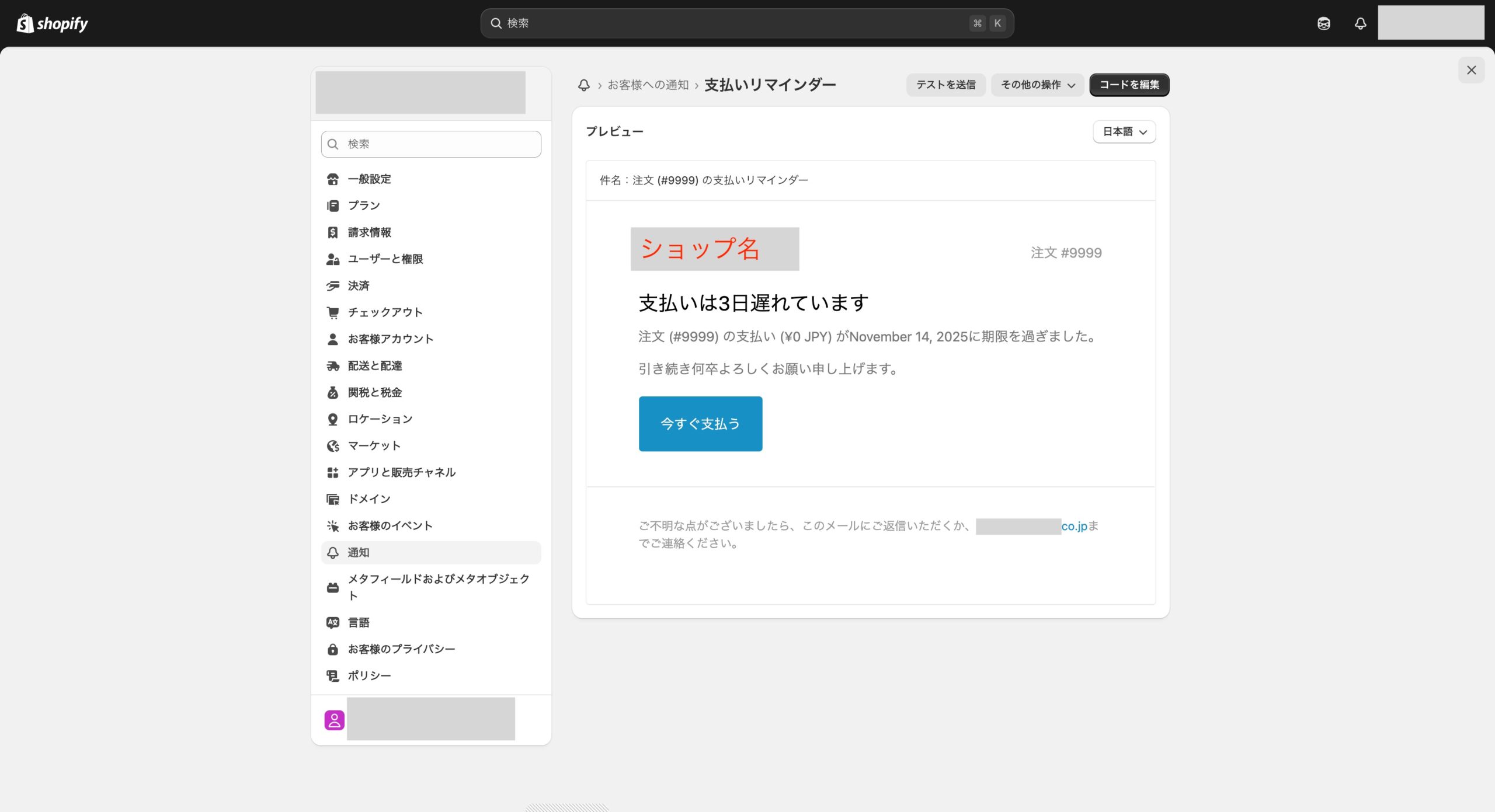 リマインダーの内容については管理画面から設定に移り、「通知」>「お客様への通知」>支払いリマインダーから設定が可能です。