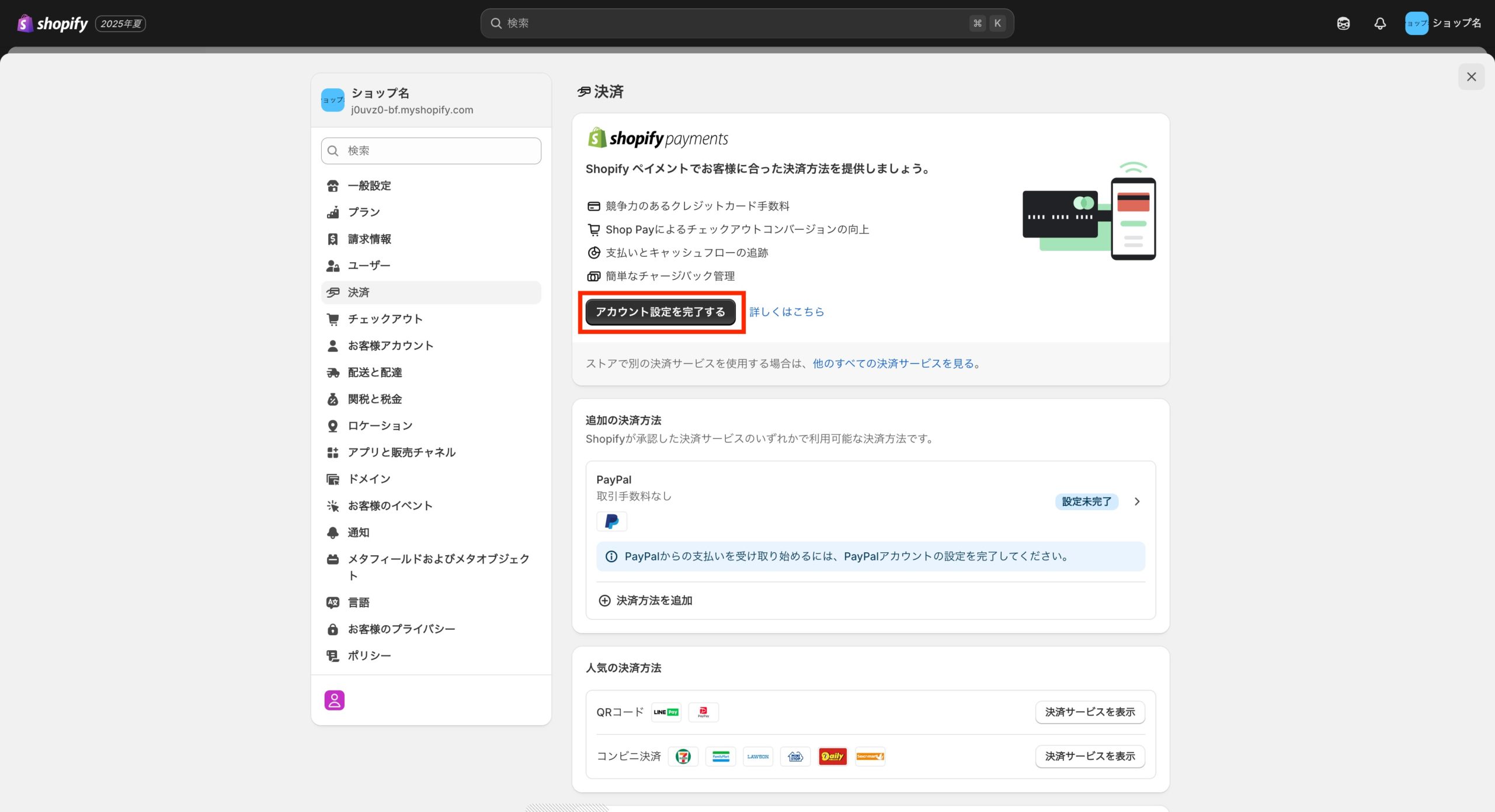 「設定」>「決済」より、Shopify ペイメントの設定が行えます。「アカウント設定を完了する」ボタンを押すとストアに関する情報を入力する画面になるので、入力していきます。