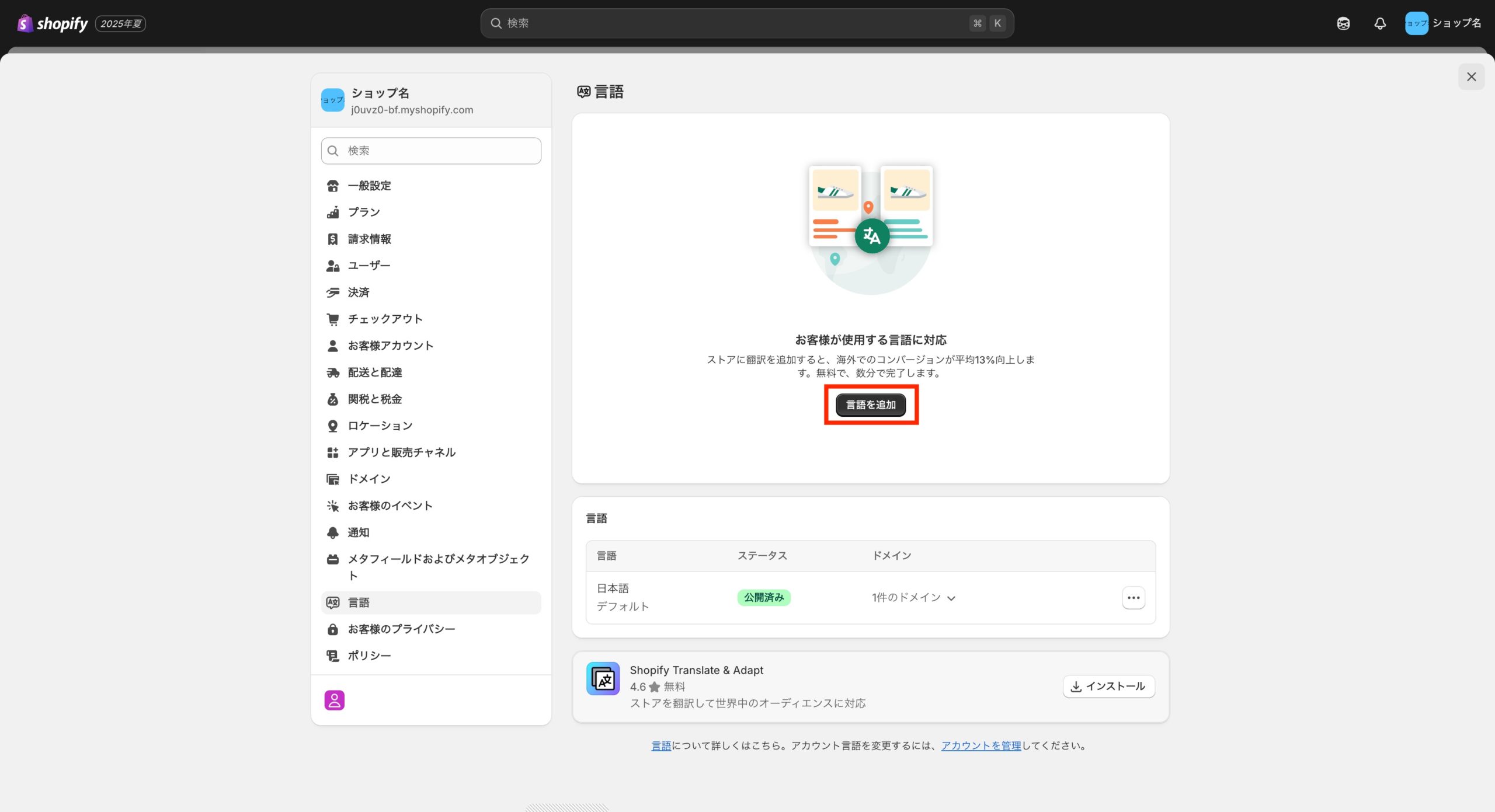 「設定」>「言語」より、言語を追加することができます。言語を追加すると自動的に「Shopify Translate & Adapt」アプリが追加されます。追加時にドメインに割り当てることもできるので、必要に応じてチェックを入れてください。