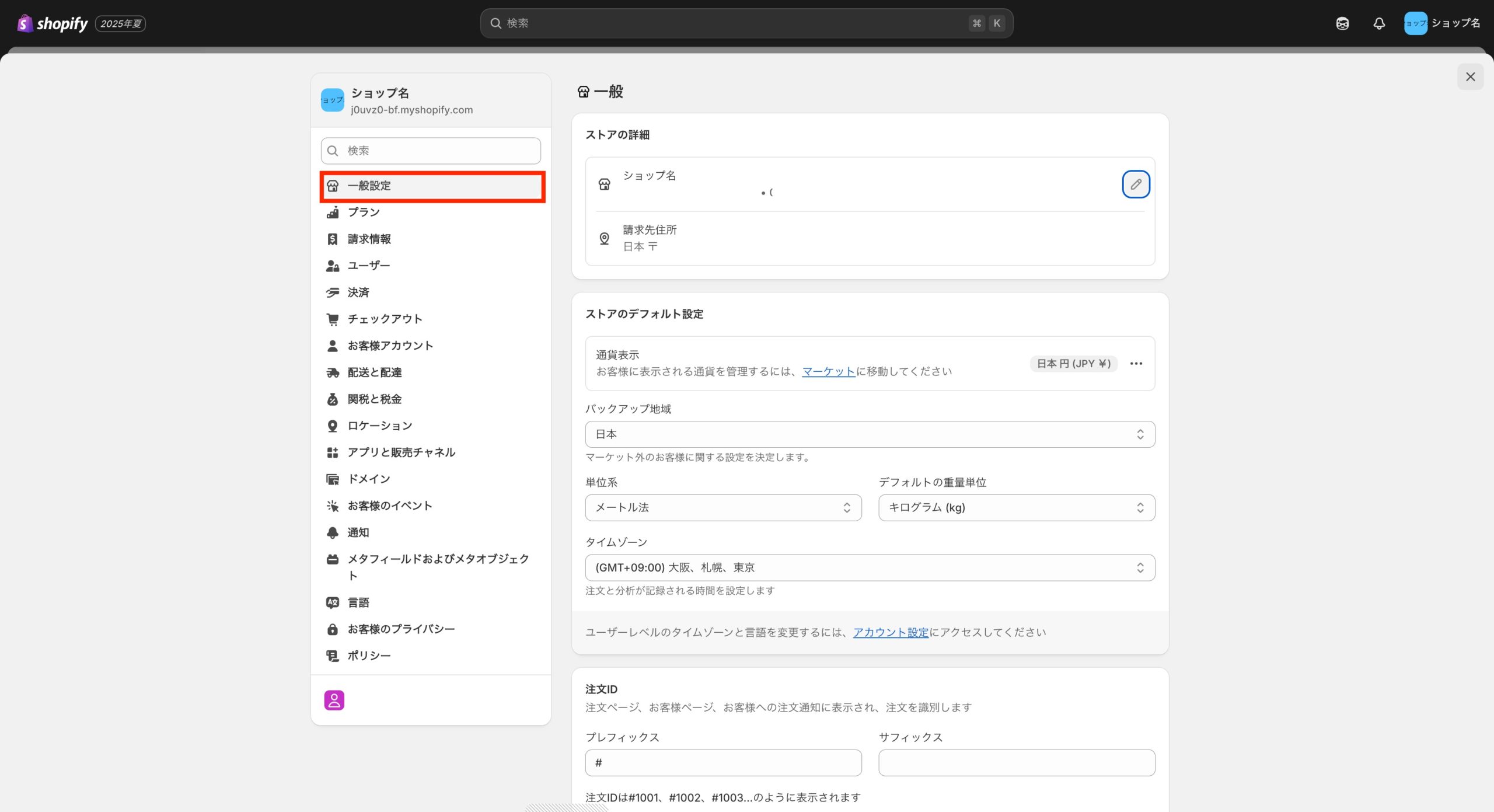 ログインしたあと、「設定」>「一般設定」よりストアの詳細情報を埋めていき、「設定」>「関税と税金」より課税地域を設定します。