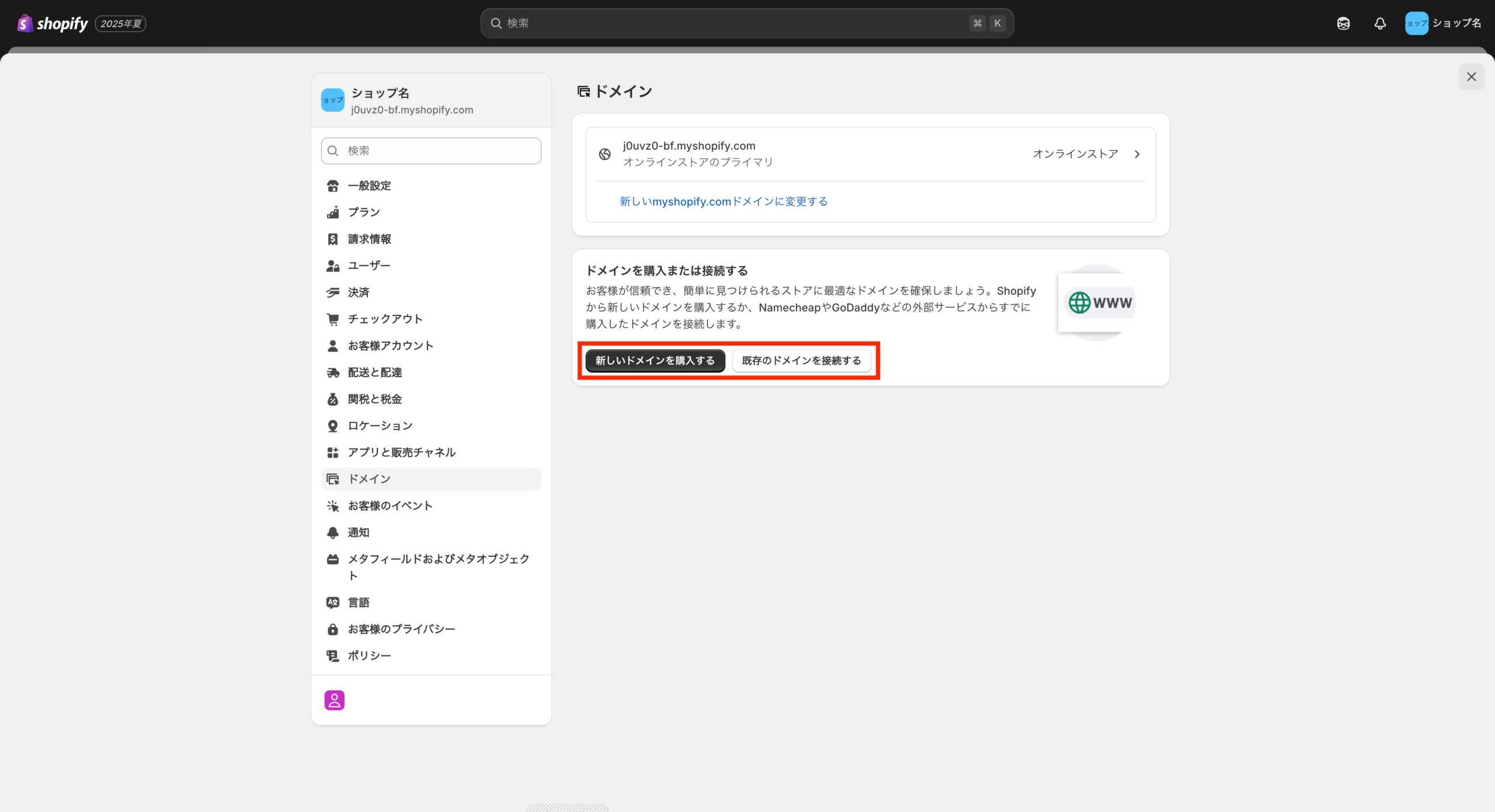 - Shopify標準のサブドメイン(○○.myshopify.com)も利用可能