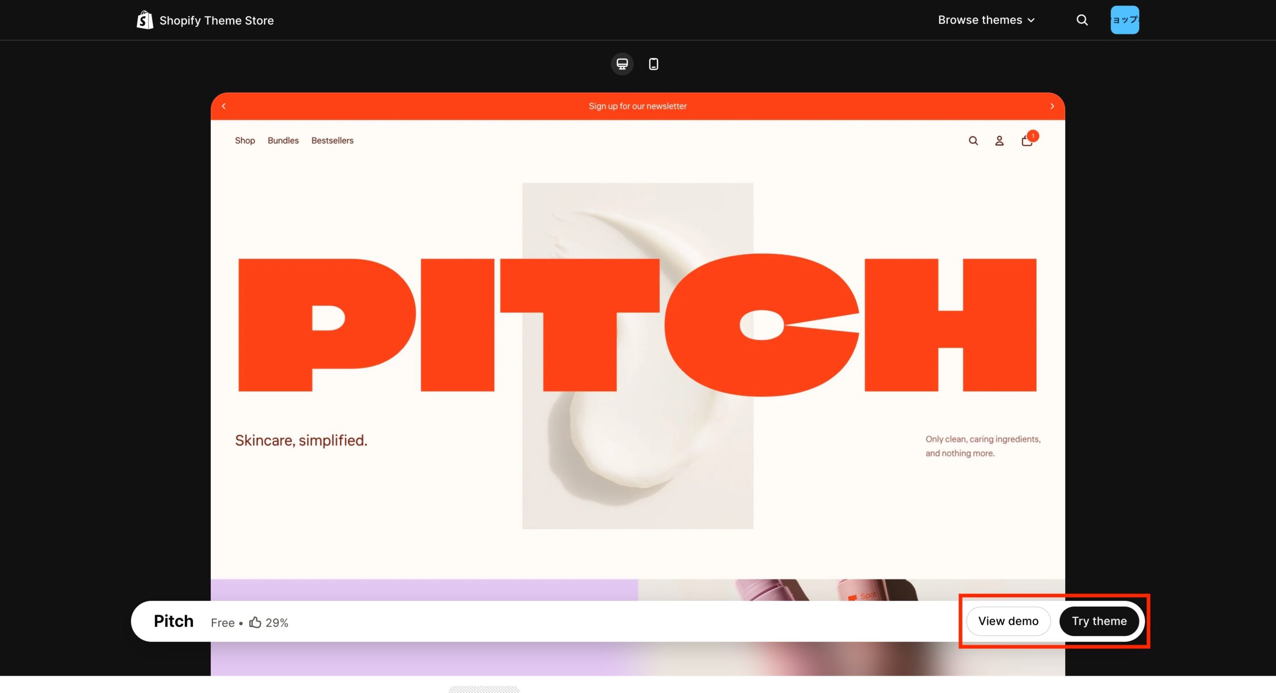 - Shopifyテーマストアから無料または有料のテーマを選択