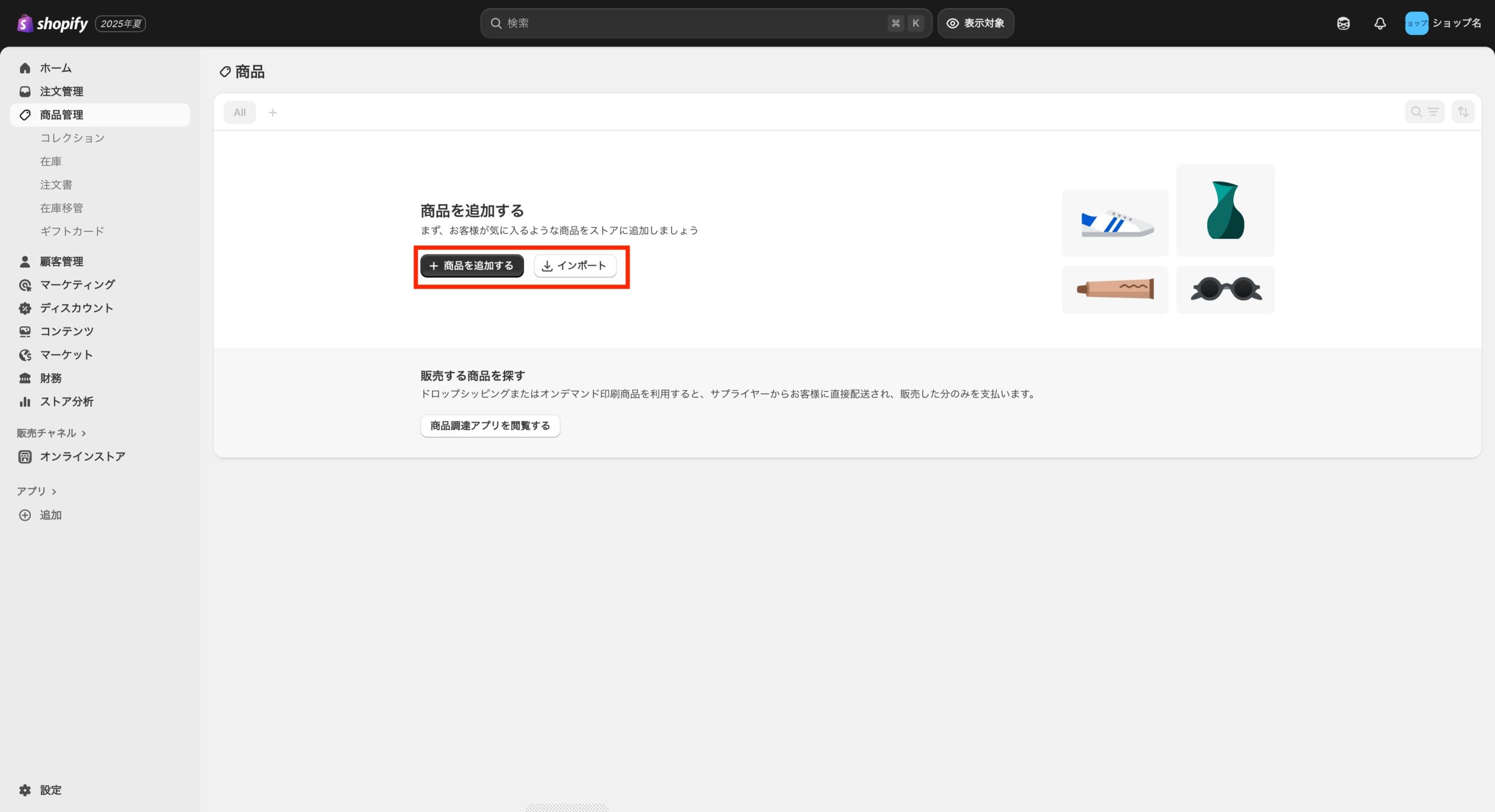 「商品管理」より追加できます。手動で入力する方法とCSVで一括登録する方法があります。