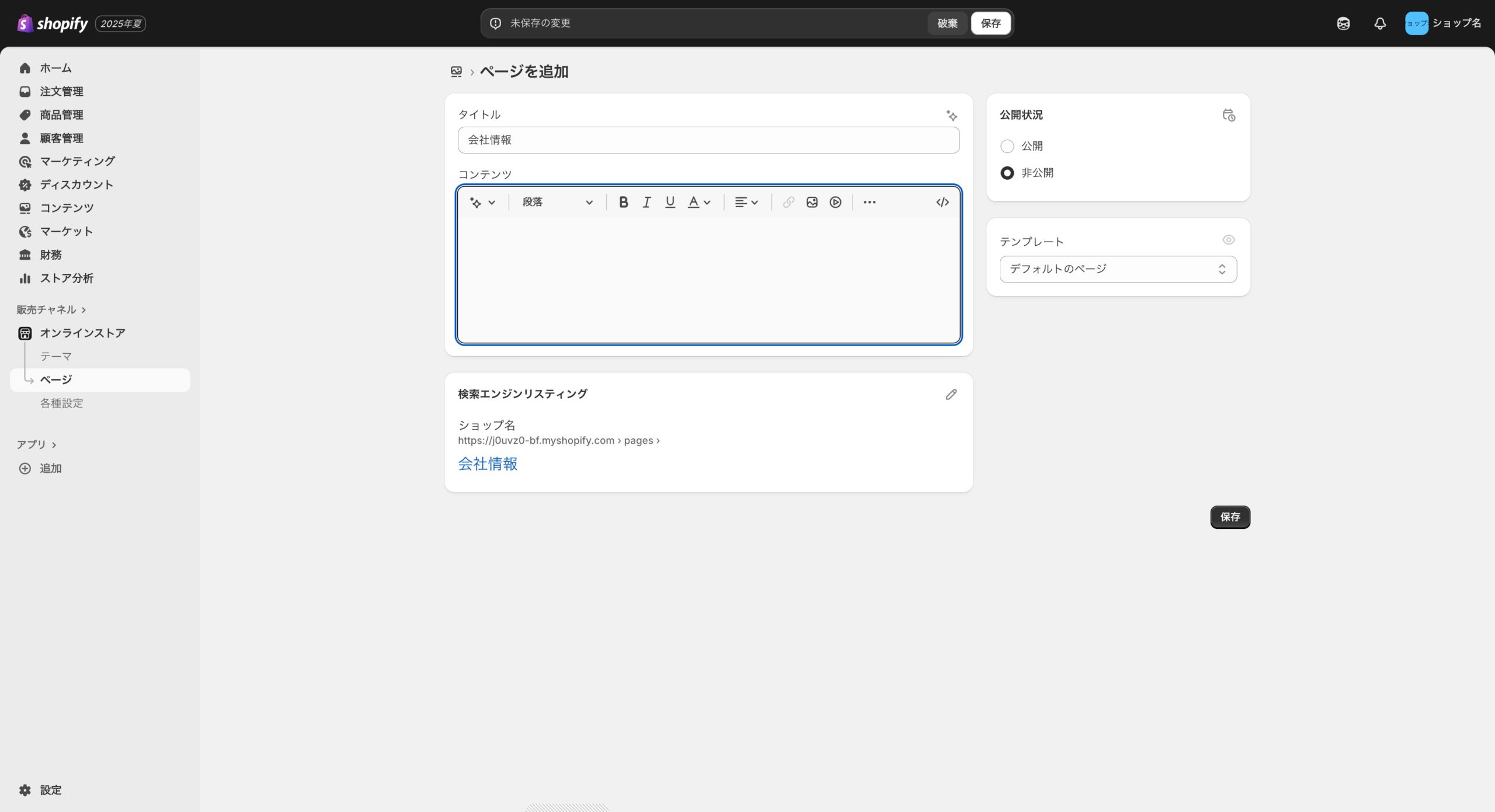 「オンラインストア」>「ページ」より、「ページを追加する」ボタンを押すと新しいページを作成することができます。