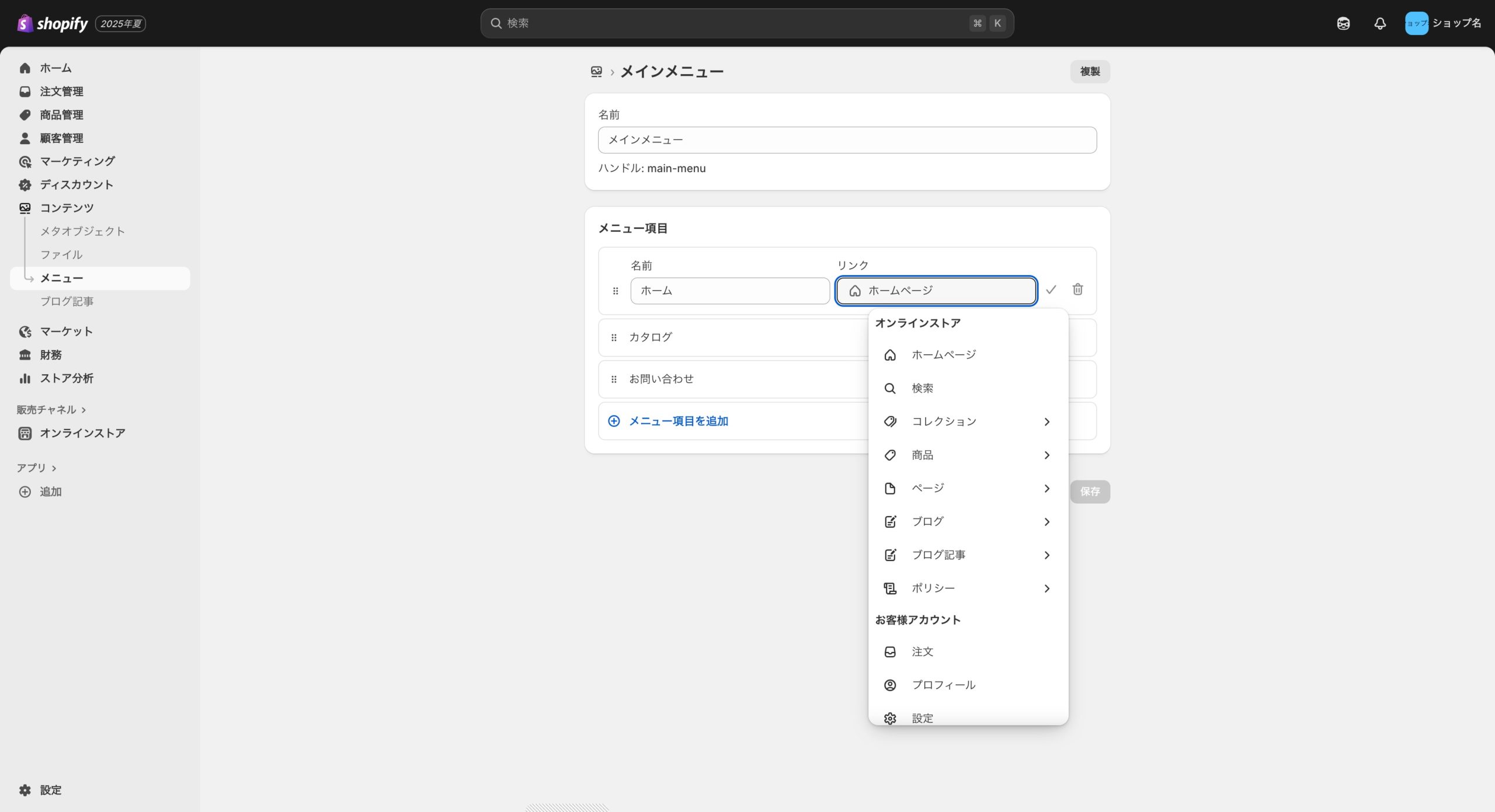「コンテンツ」>「メニュー」より、編集したいメニューを選択するとメニュー項目の操作が可能です。名前やリンク先の変更や、ドラッグで並び替えもできます。