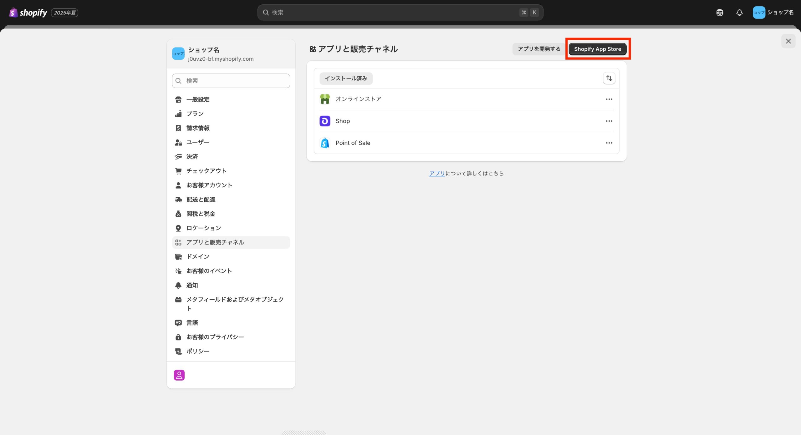 「設定」>「アプリと販売チャネル」からアプリが確認できます。追加する場合は、右上のストアボタンからストアに行き、追加したいアプリを検索します。