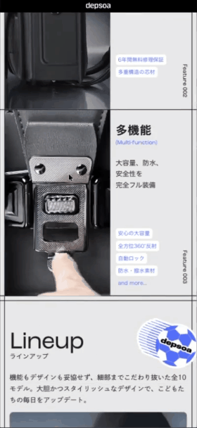 背景で流れる美しい映像と、機能と特徴部分にも動画を使用することでまるで目の前に実物があるかのような体験できWebサイトというより「高品質なショートムービー」を見ているような感覚で画面が「ただの窓」ではなく、ブランドの世界へ入り込む「入り口」になっています。