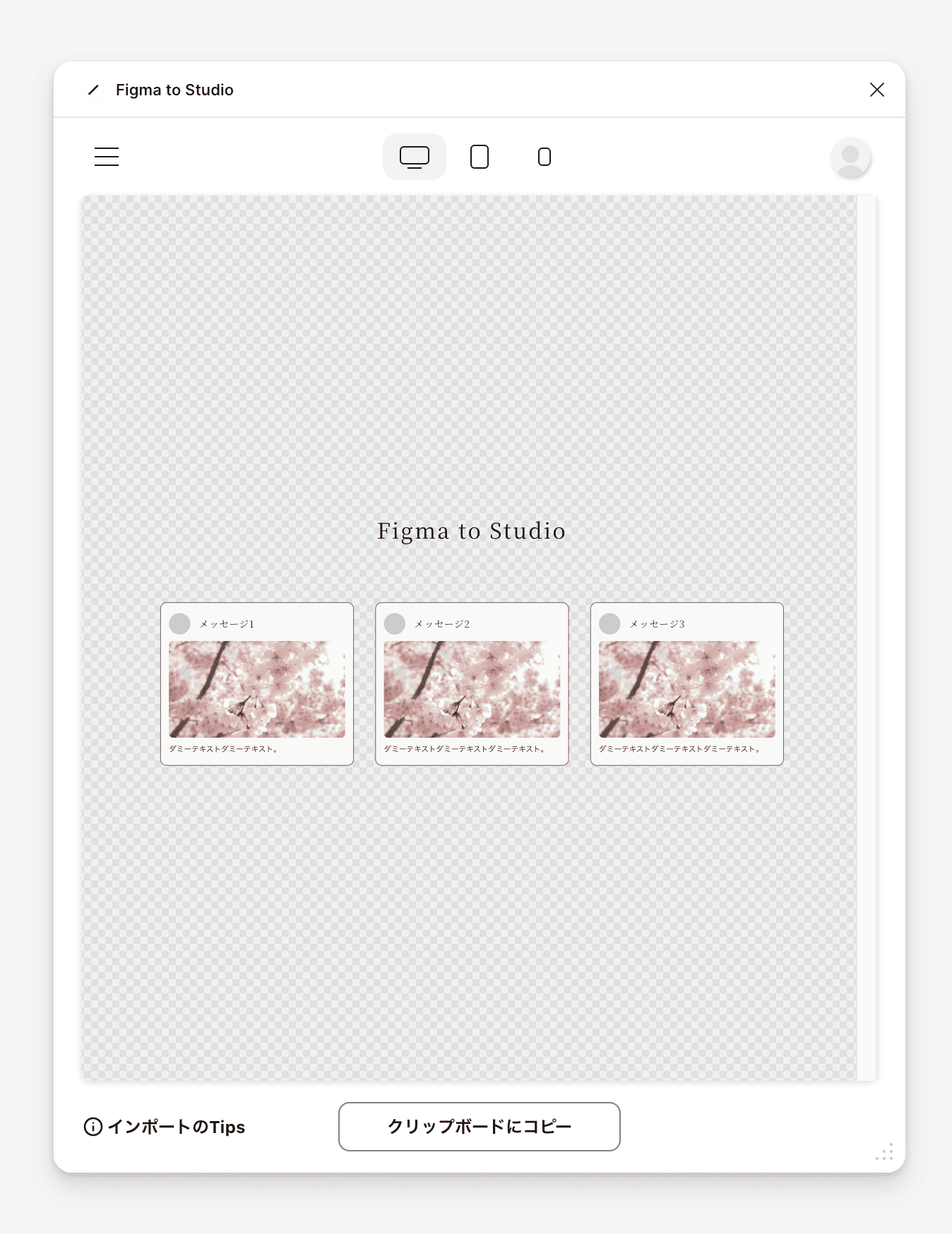 最も再現性の高いセクション単位のやり方になります。StudioへFigma to Studioを使いインポートする場合の王道フローかと思います。こちらの操作もとても簡単です。